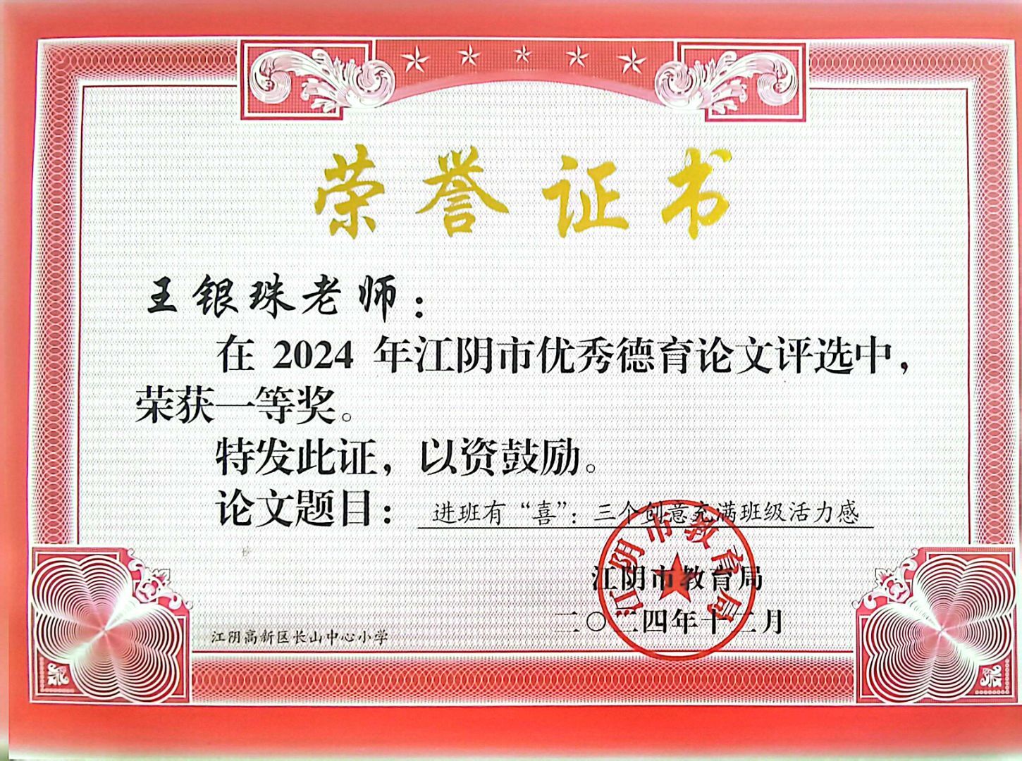 江阴市顾海英德育名师工作室——成员王银珠获2024年江阴市优秀德育论文一等奖