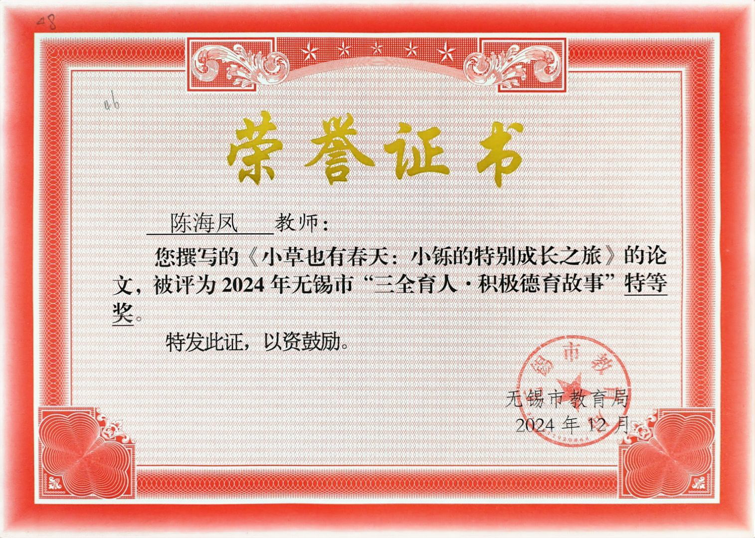 江阴市顾海英德育名师工作室——成员陈海凤获2024年无锡市“三全育人•积极德育论文”特等奖
