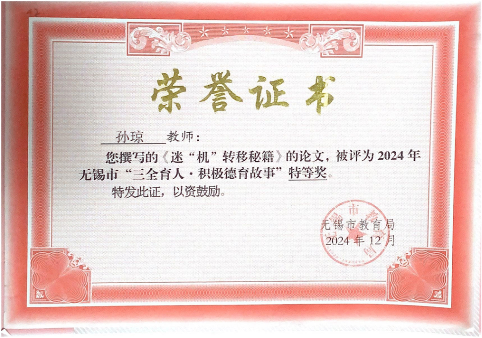 江阴市顾海英德育名师工作室——成员孙琼获2024年无锡市“三全育人•积极德育论文”特等奖