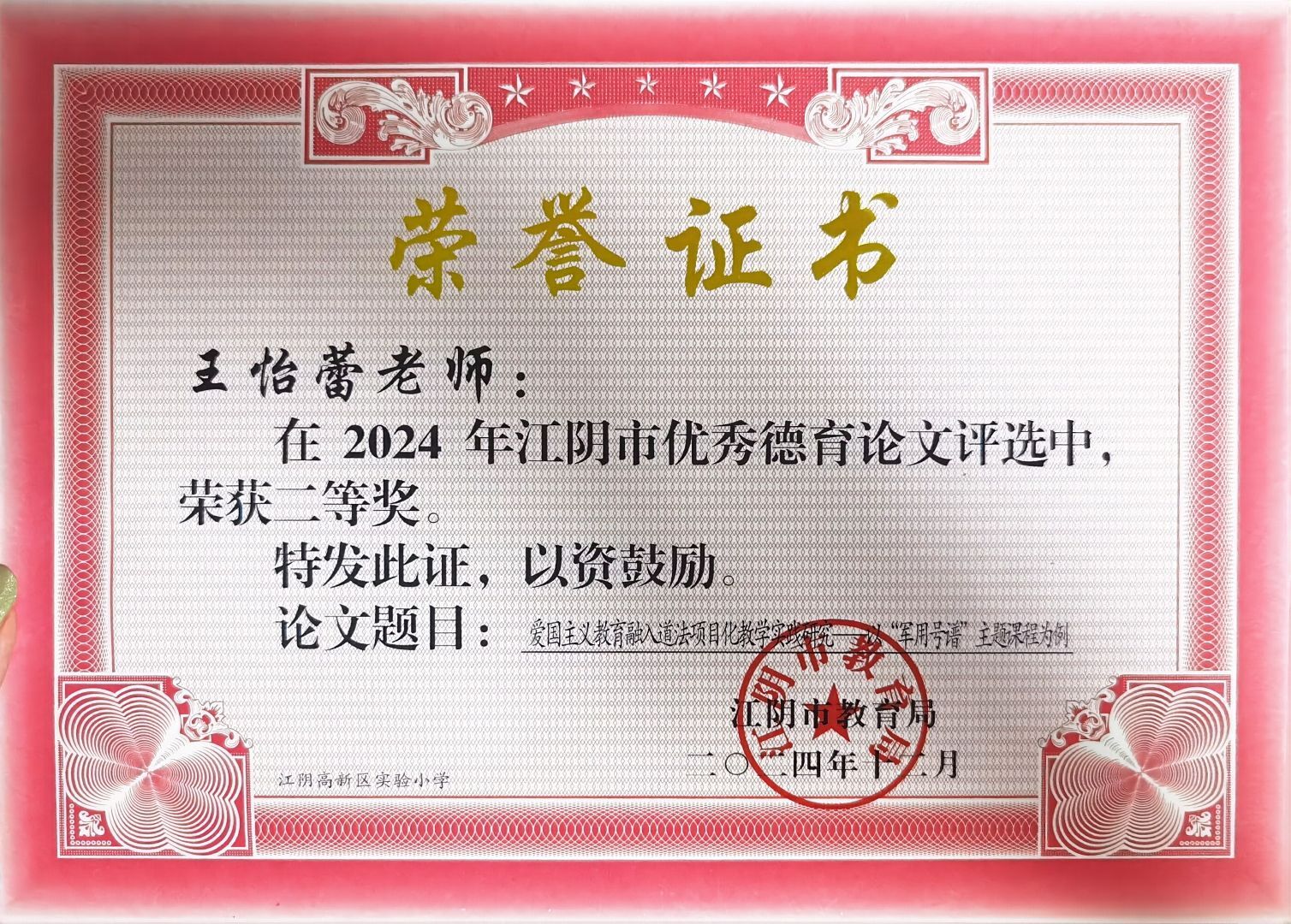 江阴市顾海英德育名师工作室——成员王怡蕾获2024年江阴市优秀德育论文二等奖
