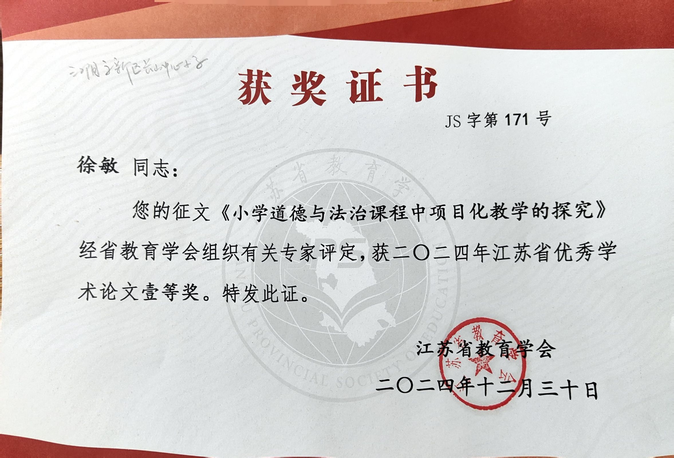 江阴市顾海英德育名师工作室——成员徐敏获2024年江苏省优秀论文一等奖