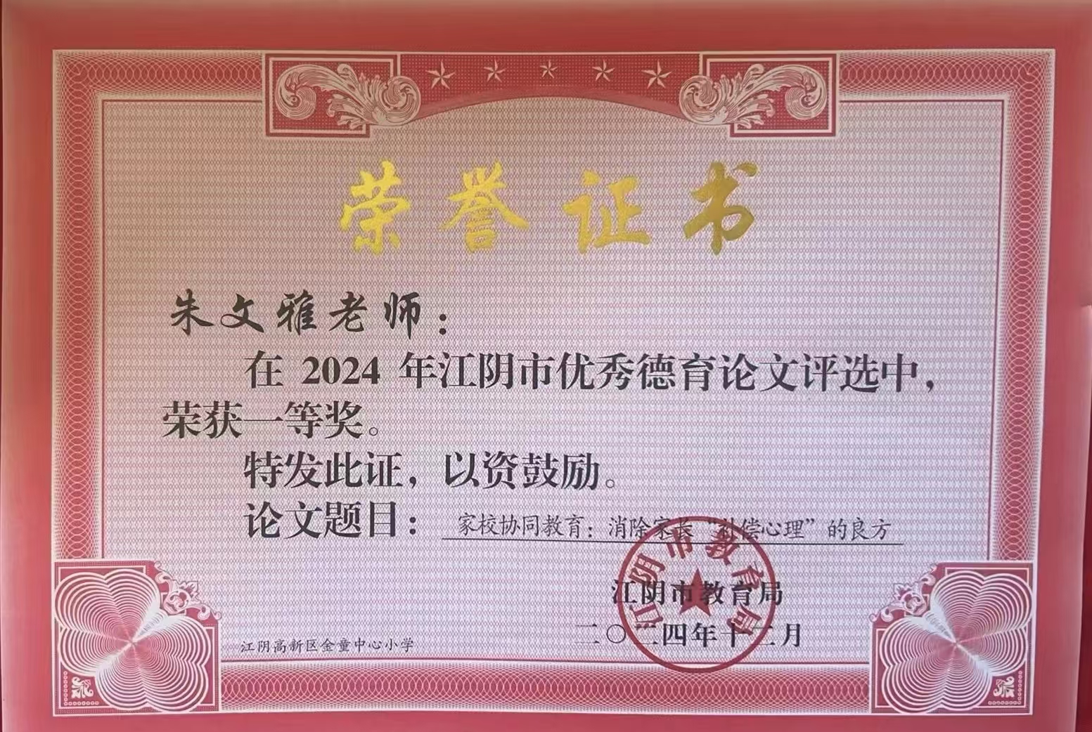 江阴市顾海英德育名师工作室——成员朱文雅获2024年江阴市优秀德育论文一等奖 2025-09-21