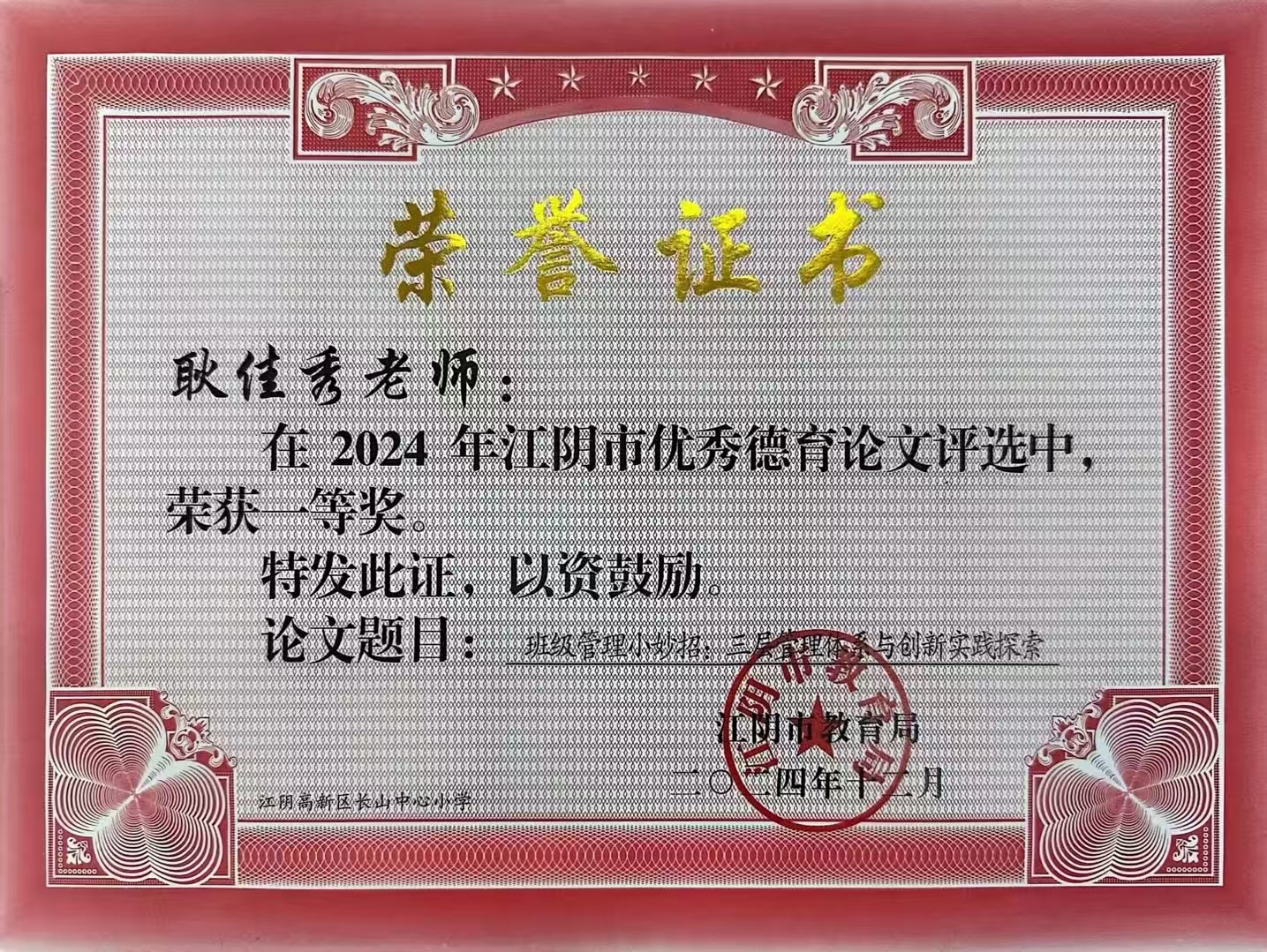 上一篇: 江阴市顾海英德育名师工作室——成员朱文雅获2024年江阴市优秀德育论文一等奖 | 下一篇: 江阴市顾海英德育名师工作室——成员黄丽娟获2024年江阴市优秀德育论文二等奖