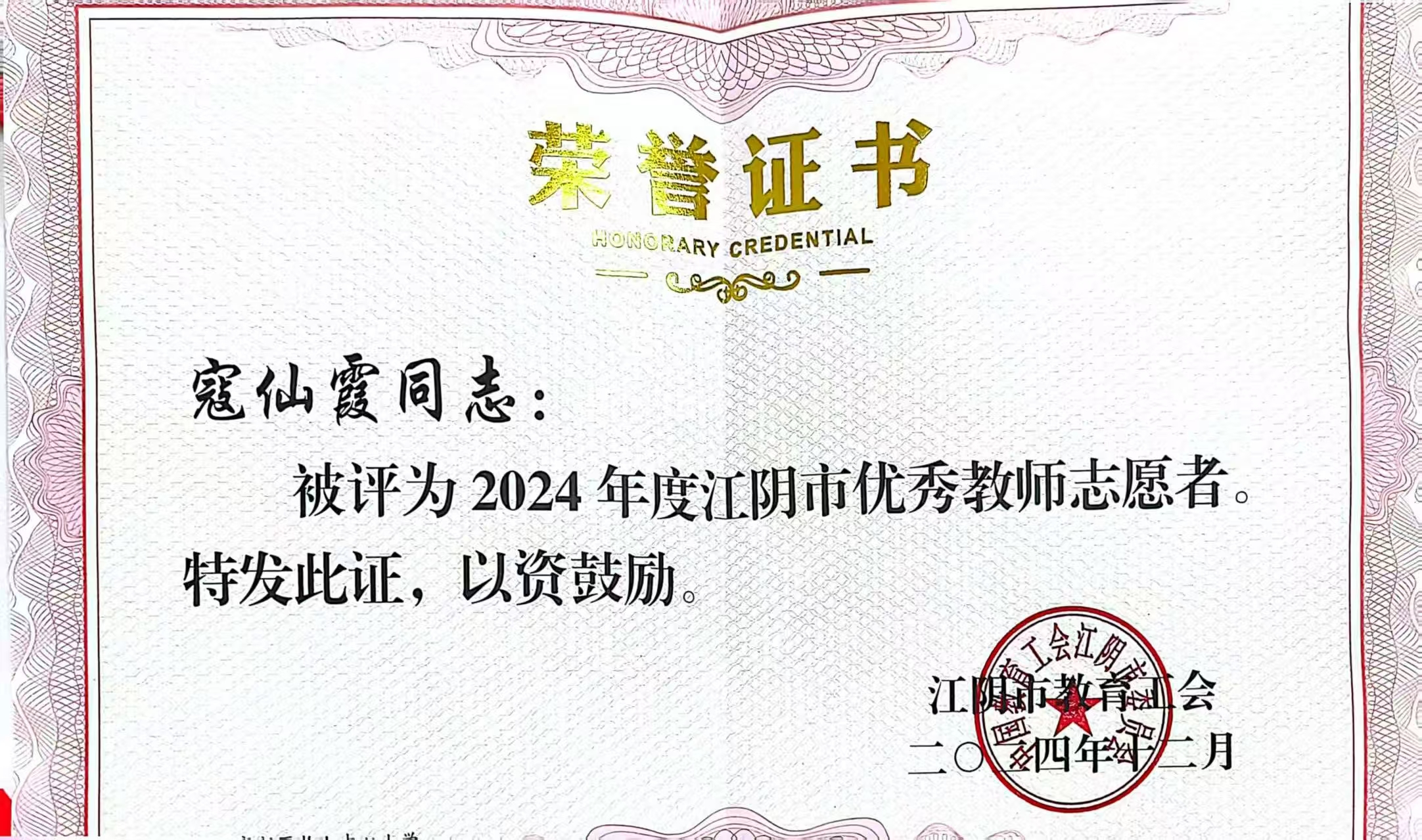 江阴市顾海英德育名师工作室——成员寇仙霞获评2024年江阴市优秀教师志愿者
