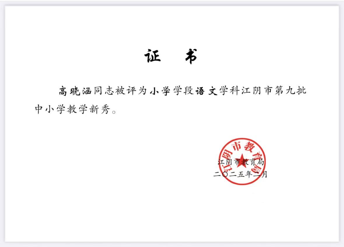 江阴市顾海英德育名师工作室——成员高晓涵被评为小学学段语文学科江阴市第九批中小学教学新秀