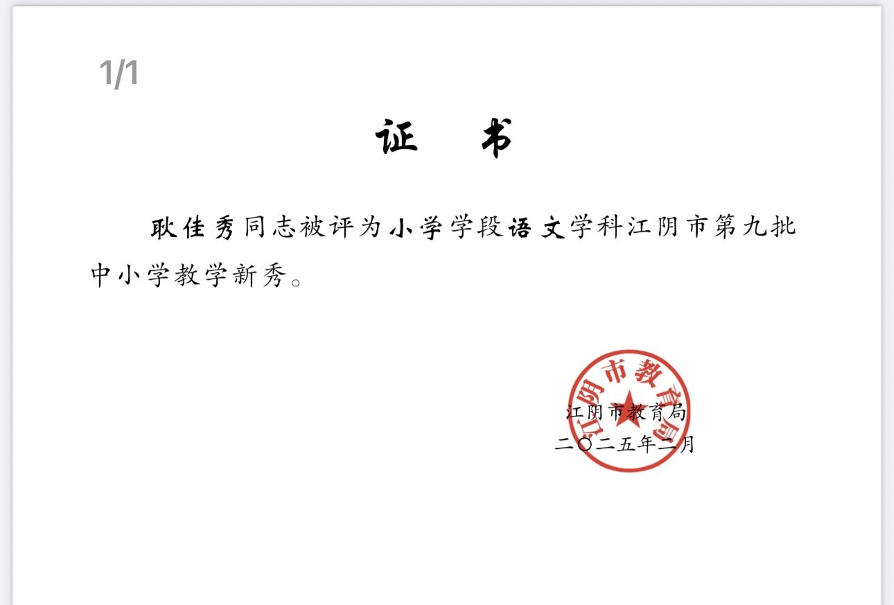 江阴市顾海英德育名师工作室——成员耿佳秀被评为小学学段语文学科江阴市第九批中小学教学新秀 2025-09-21