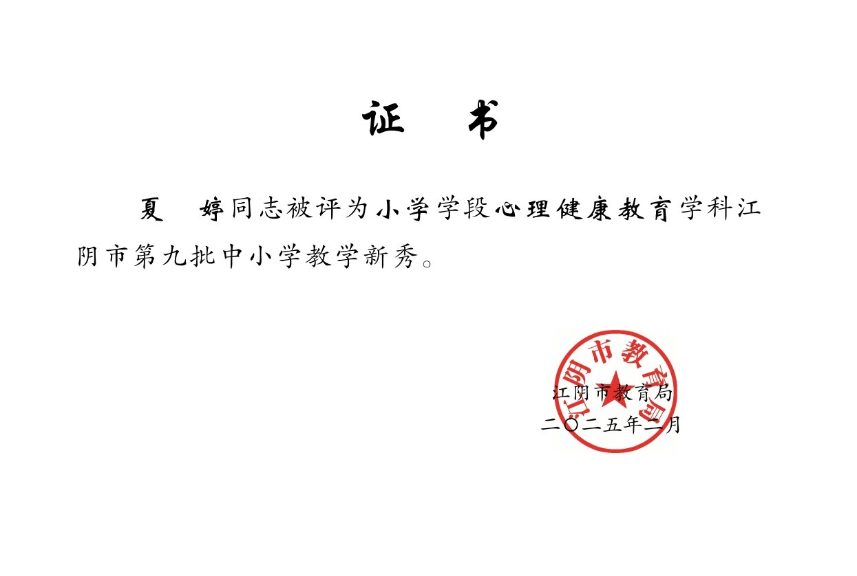 江阴市顾海英德育名师工作室——成员夏婷被评为小学学段心理健康教育学科江阴市第九批中小学教学新秀