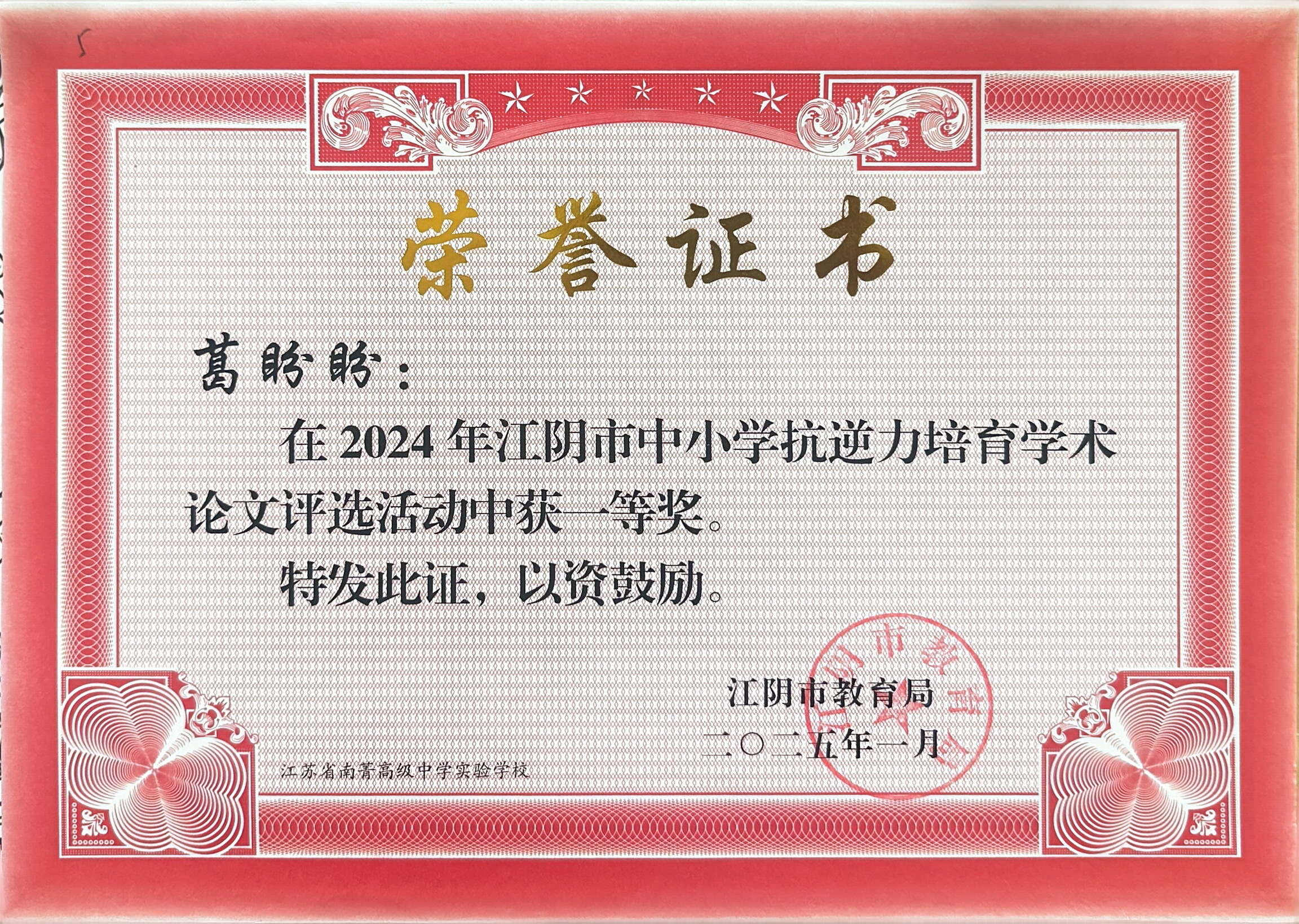 2025001葛盼盼2024年江阴市中小学抗逆力培育学术论文一等奖