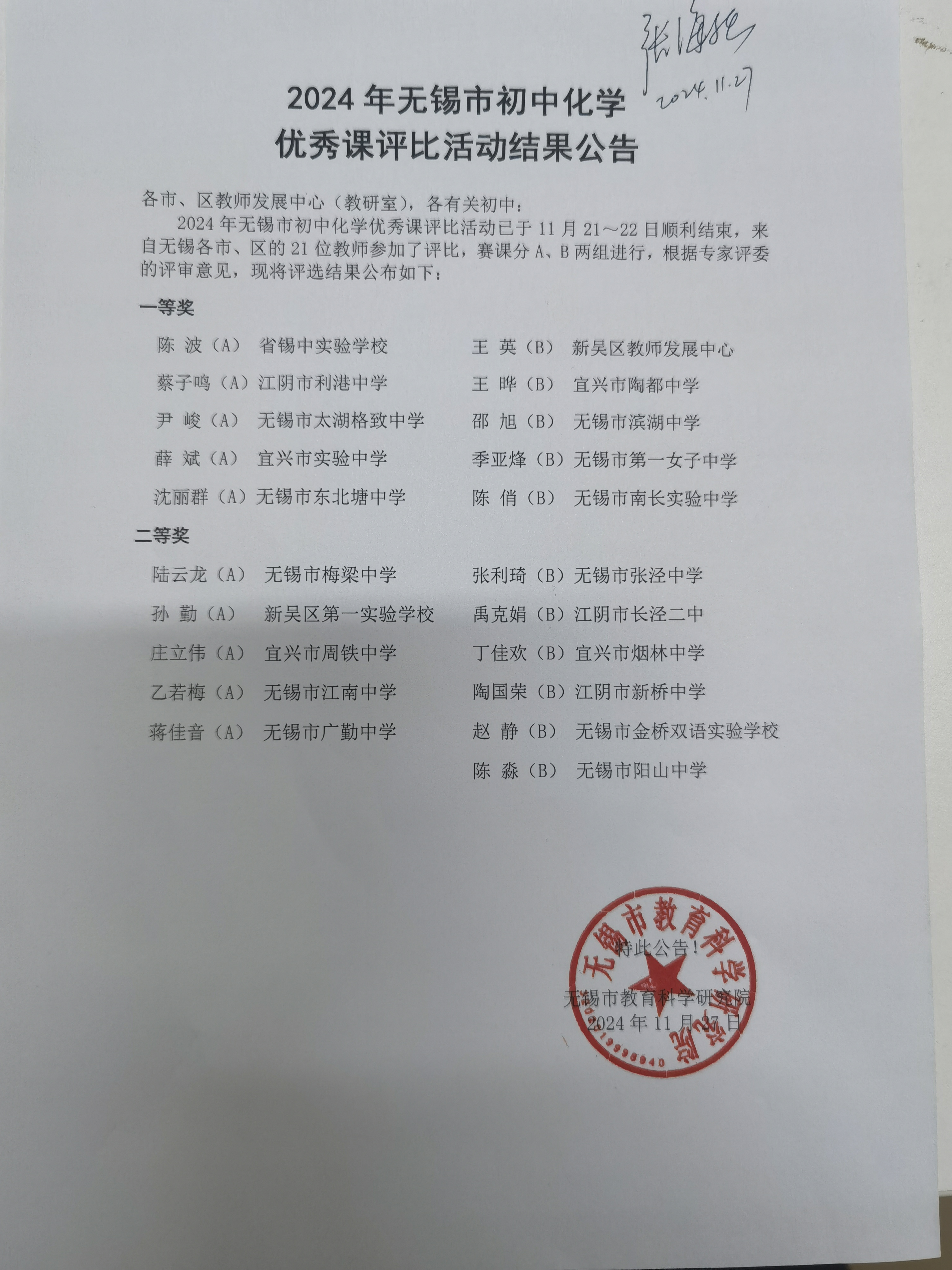 网站类目:学科比赛情况 姓名:禹克娟 所在单位:江阴市教育局 获奖类别:无锡市初中化学优秀课评比 获奖级别:市级 获奖等级: 获奖时间:2024-11-27 评比部门:无锡市教育科学研究院 发表刊物: 刊物级别:市级 发表时间:2025-09-22
