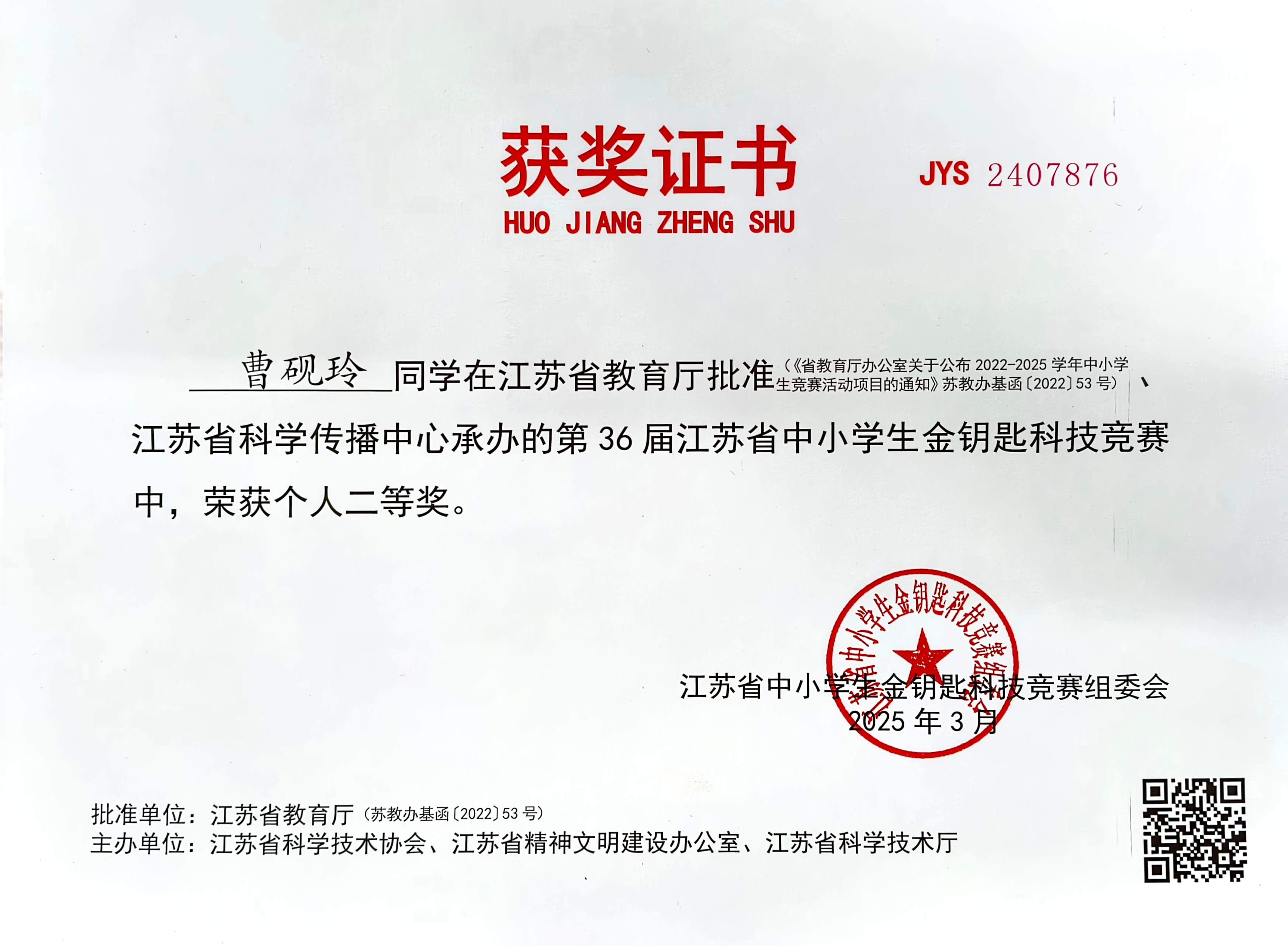 段愉悦+辅导11名学生参加江苏省中小学实验知识竞赛获奖