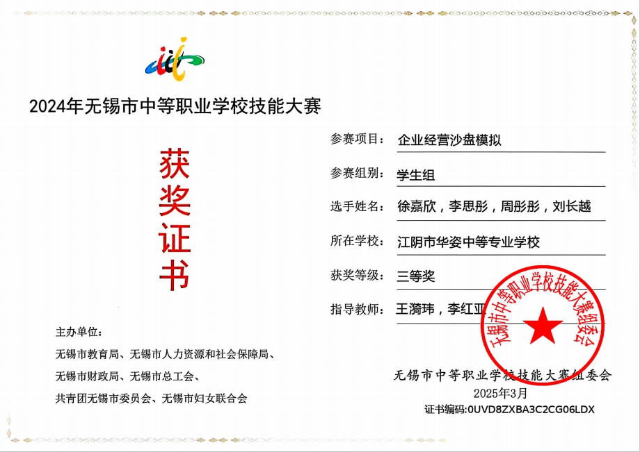 王漪玮老师的团队指导学生获无锡市技能大赛三等奖
