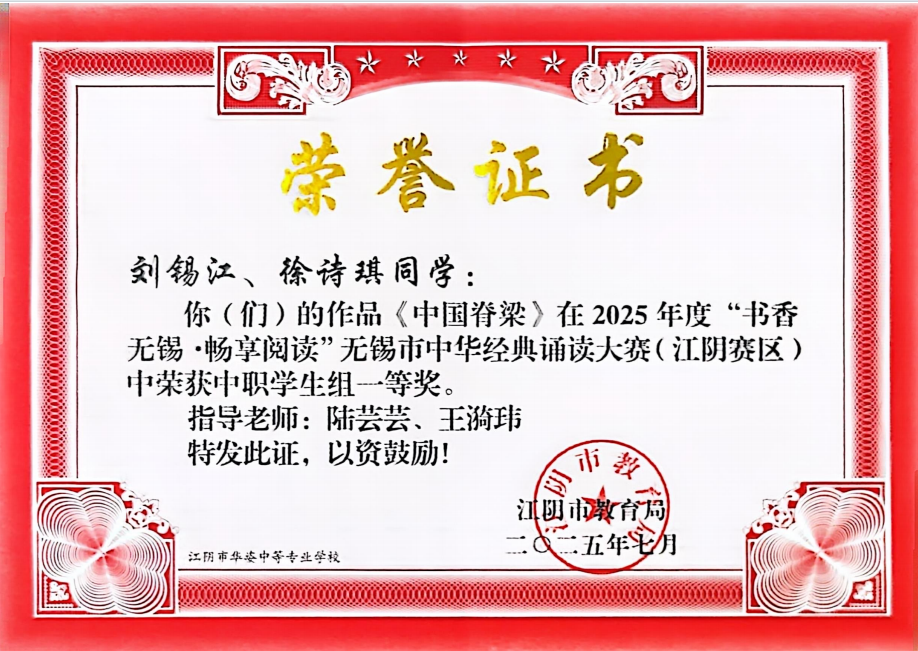 王漪玮老师的团队指导学生在“书香无锡•畅享阅读” 无锡市中华经典诵读大赛(江阴赛区)中荣获一等奖 2025-09-22