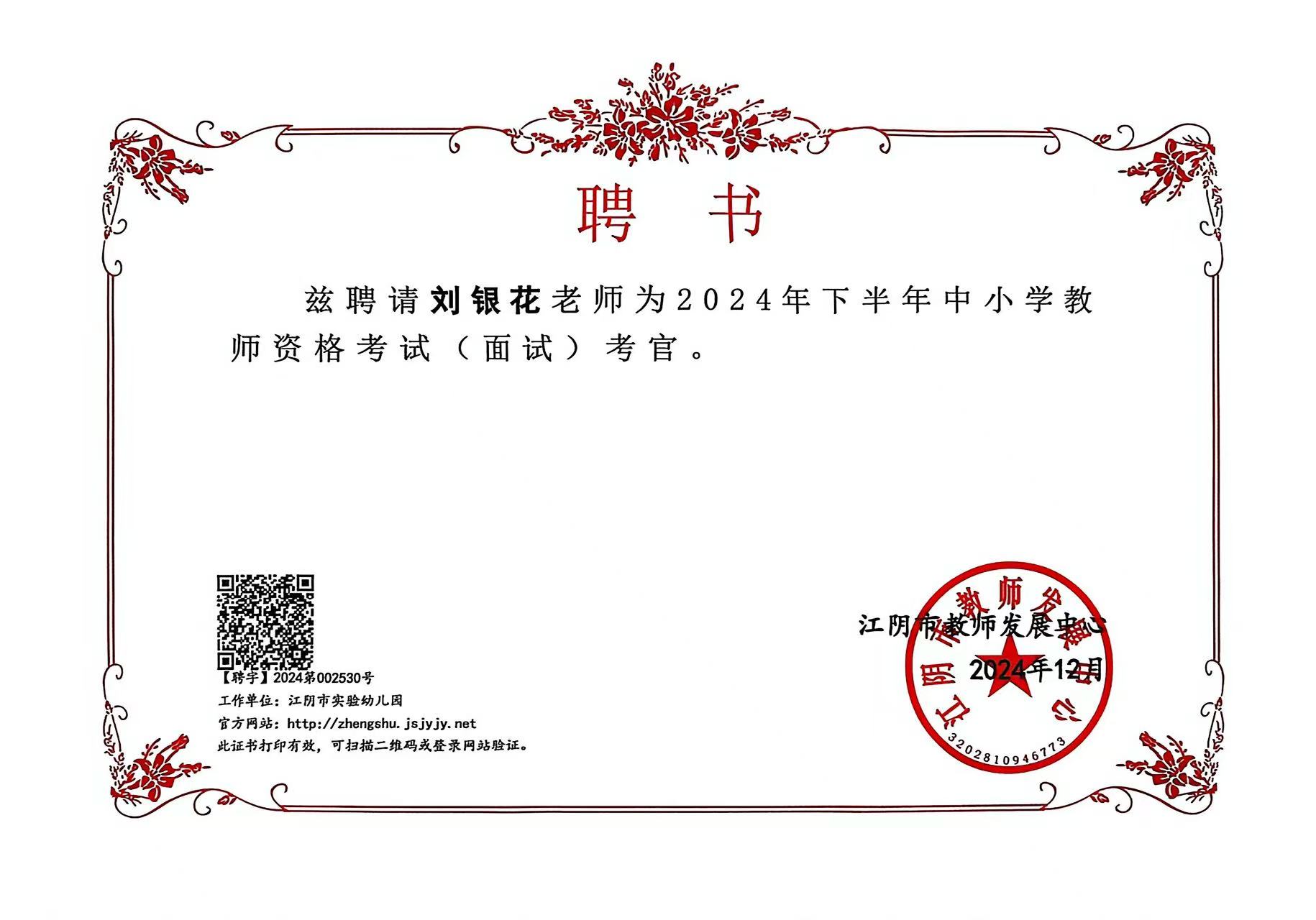 刘银花老师被聘为2024年下半年中小学教师资格考试(面试)考官