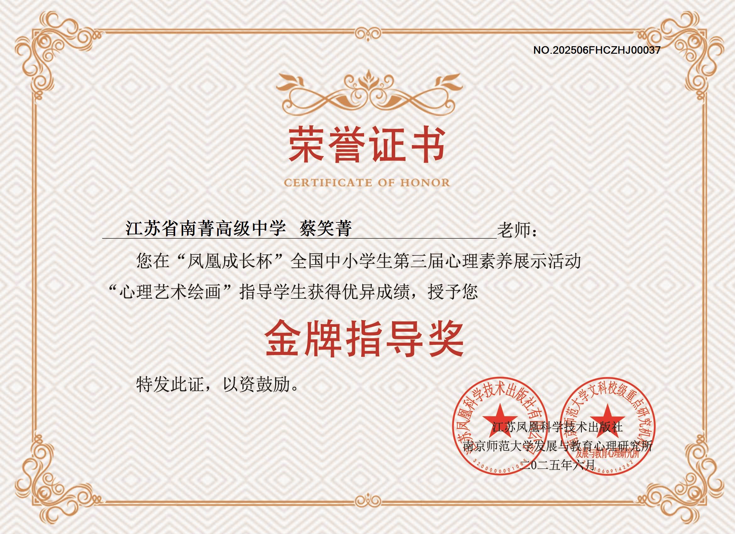 蔡笑菁在“凤凰成长杯”全国中小学生第三届心理素养展示活动“心理艺术绘画”中获得金牌导师奖