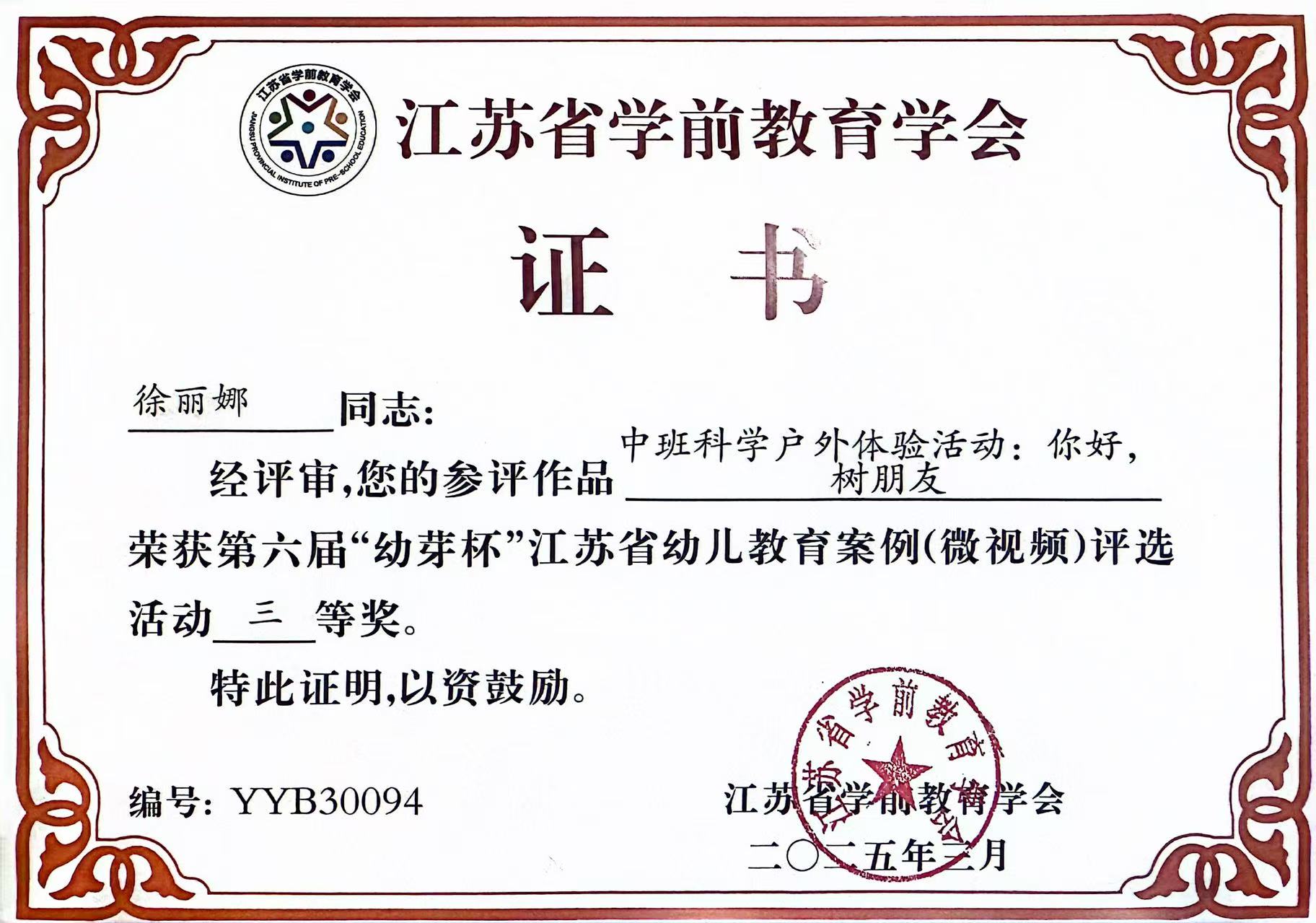 徐丽娜老师参评作品《你好,树朋友》获幼芽杯江苏省幼儿教育案例评选活动三等奖 2025-09-22