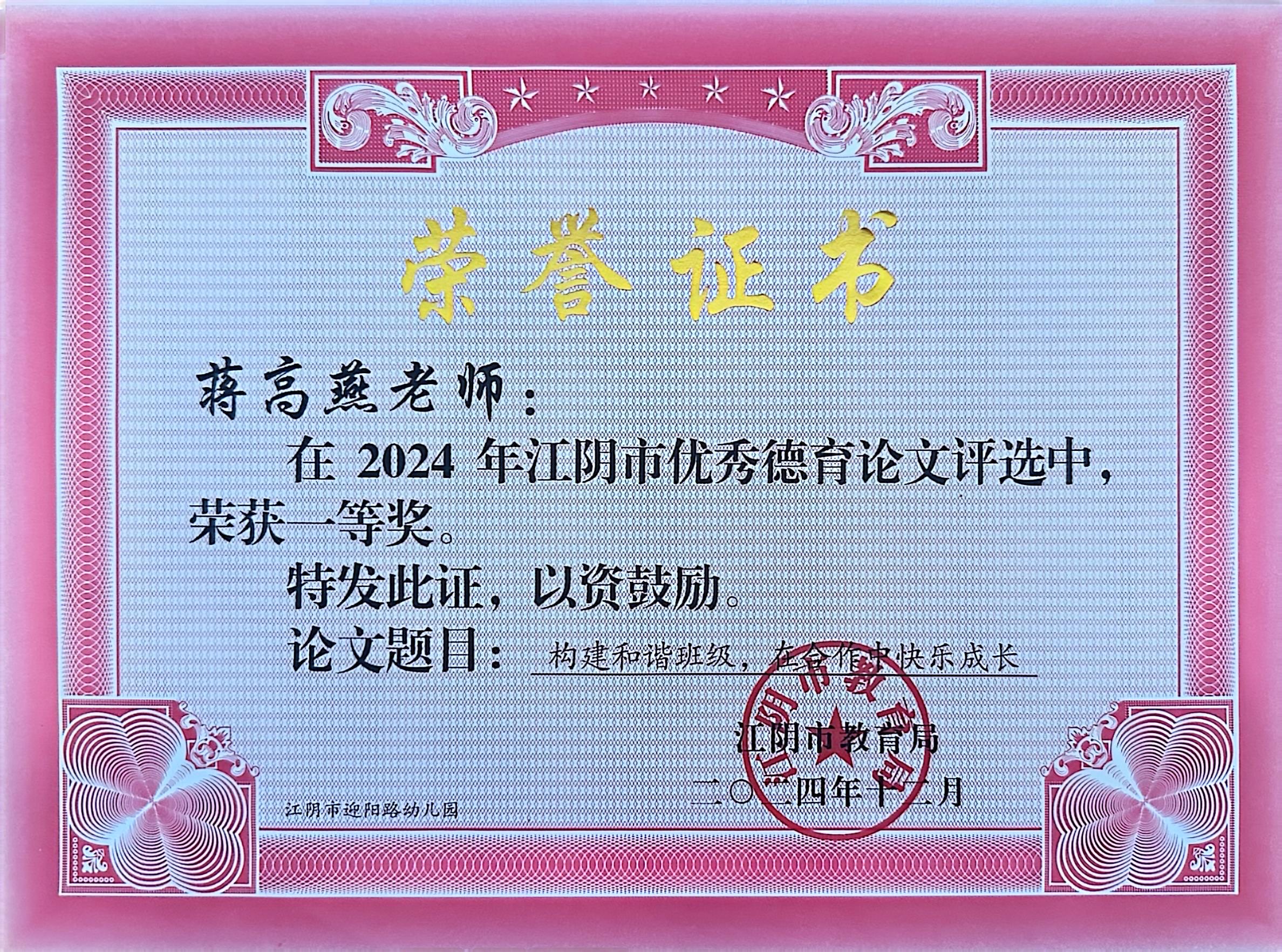 蒋高燕老师在江阴市优秀德育论文评选中获一等奖 2025-09-22