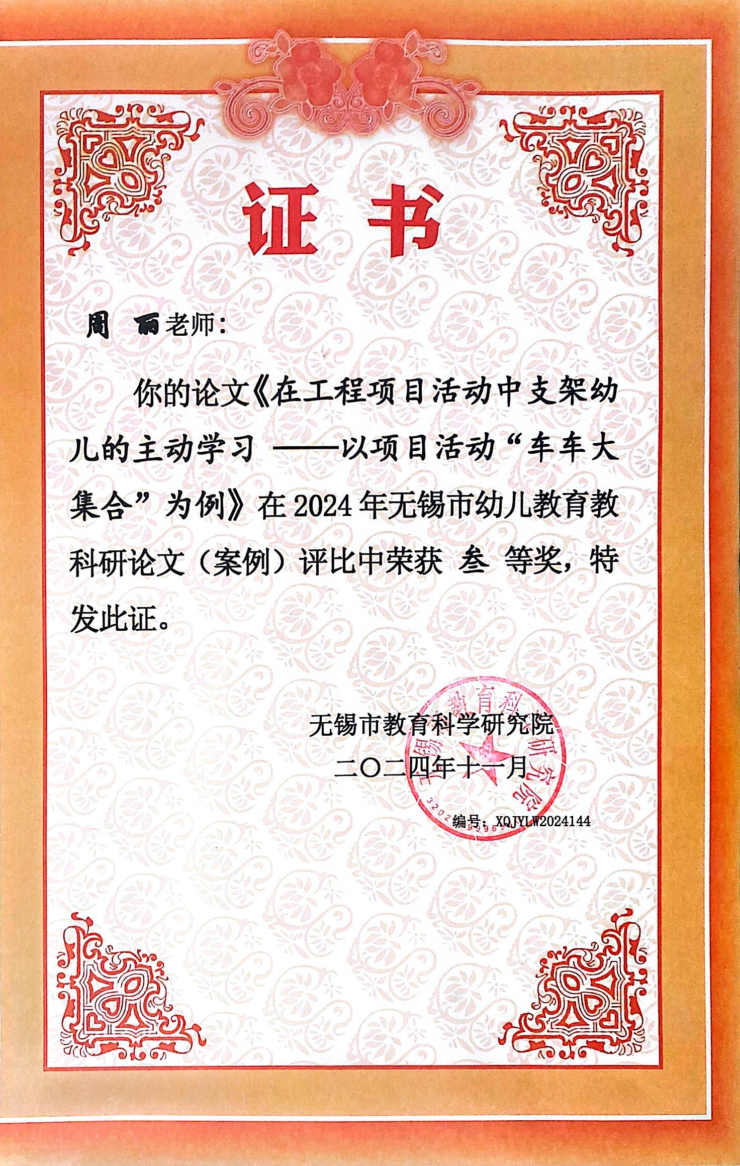 周丽老师撰写的论文在2024无锡市幼儿教育叫科研论文评比中获三等奖 2025-09-22