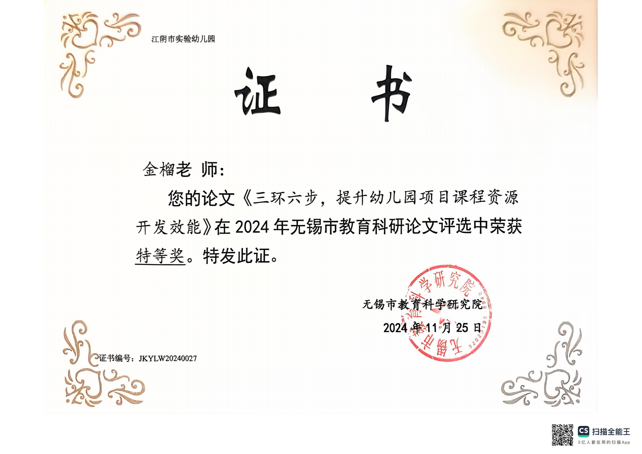 金榴老师撰写的论文在无锡市教育科研论文评选中获特等奖