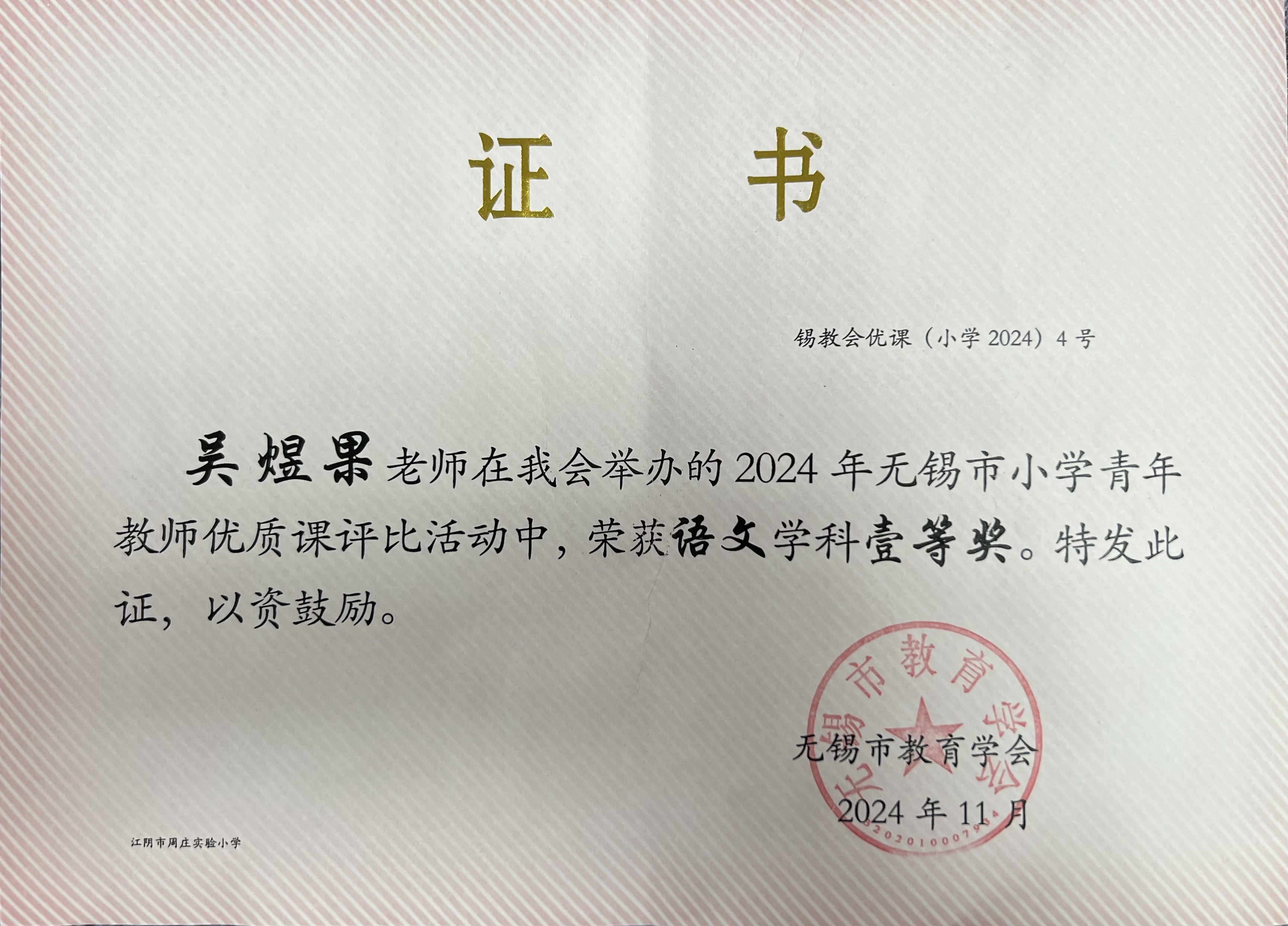吴煜果获2024年无锡市小学青年教师优质课评比语文学科一等奖 2025-09-22
