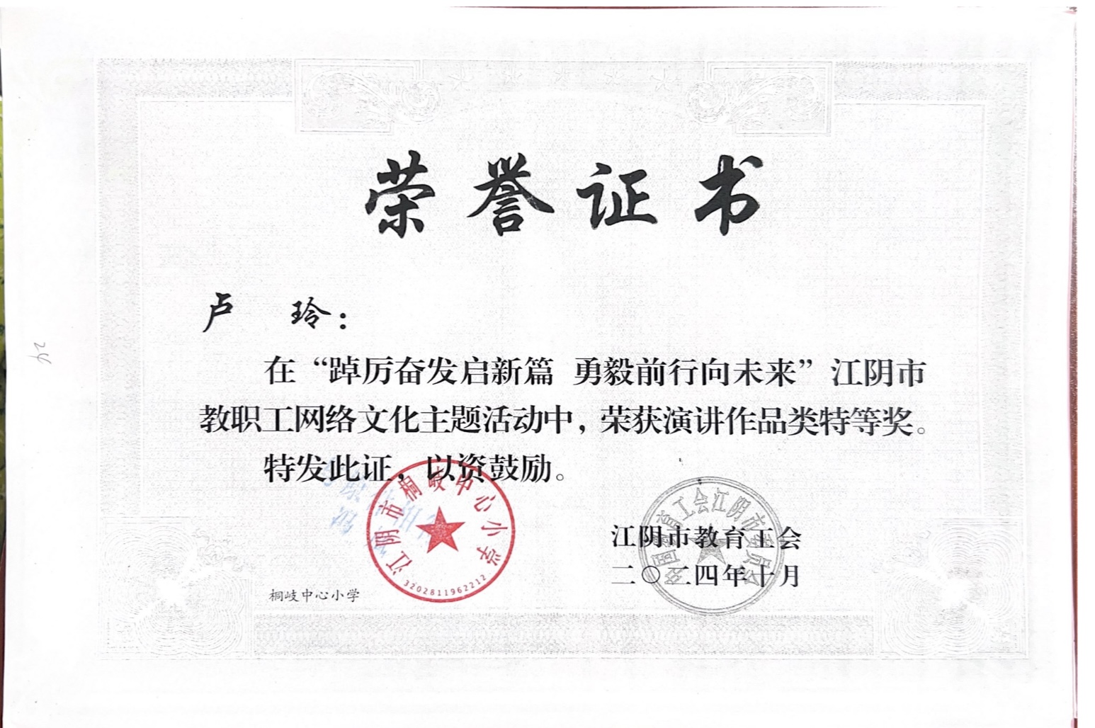 卢玲老师获得江阴市教职工演讲比赛特等奖