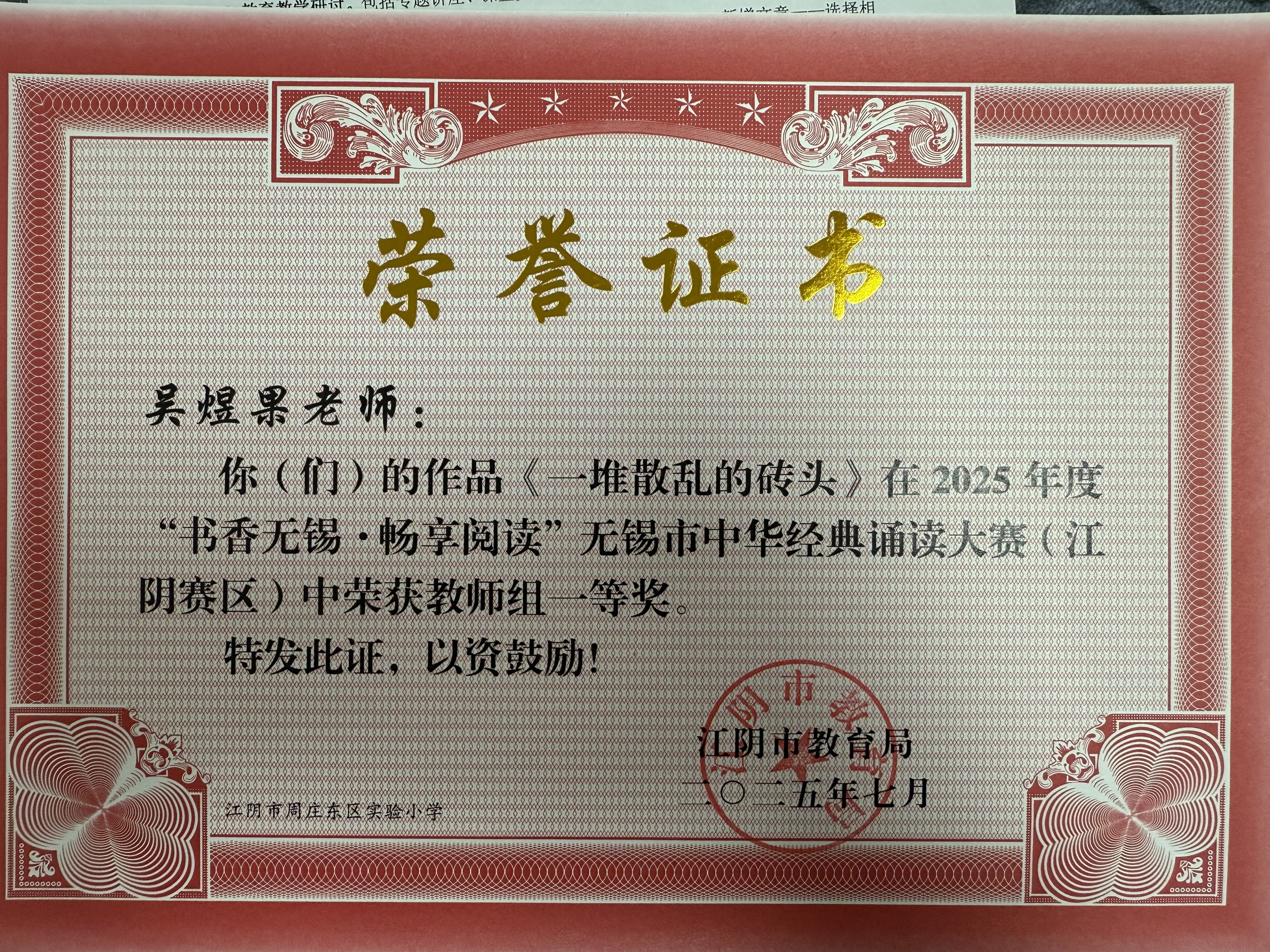 吴煜果获2025年度无锡市中华经典诵读大赛教师组一等奖