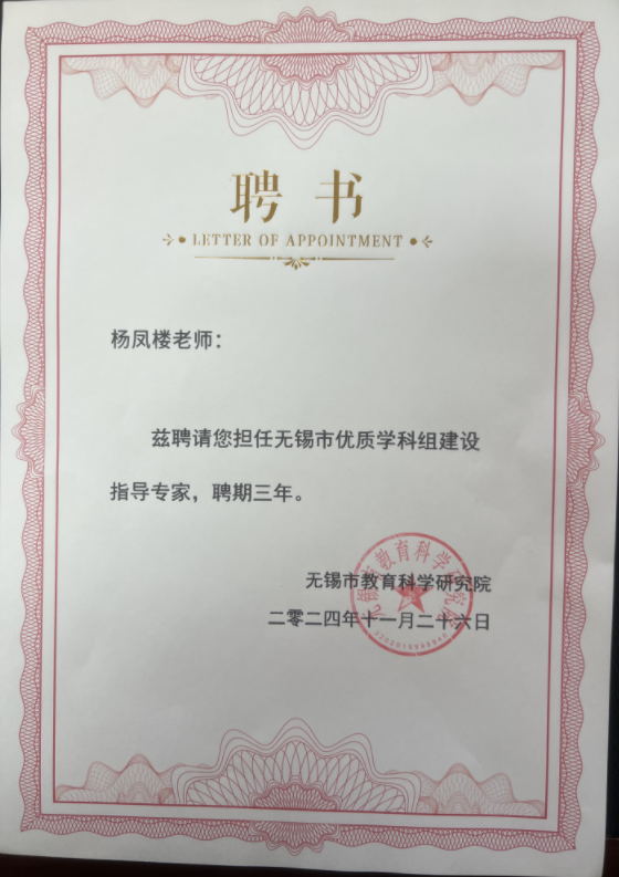 网站类目:荣誉提升情况 姓名:杨凤楼 所在单位:江阴市教育局 荣誉类别:特级教师 荣誉级别:市级 获得时间:2024-11-26 评比部门: