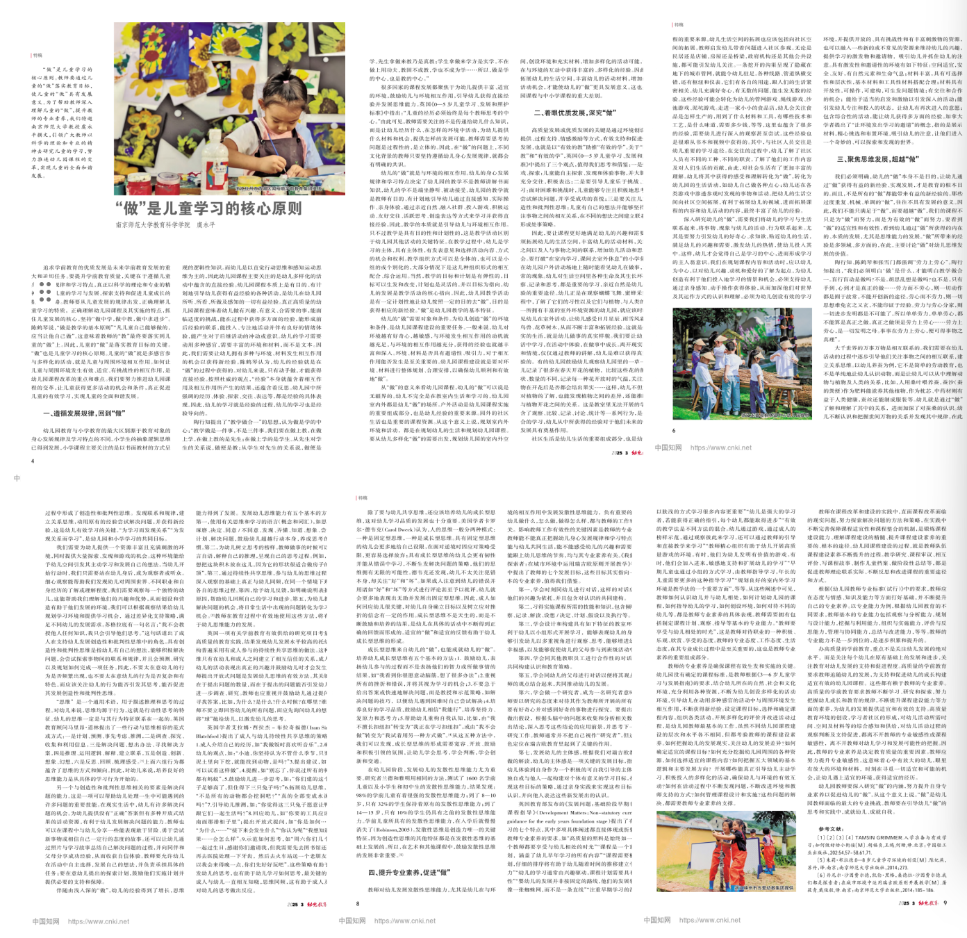 本文围绕“做”是儿童学习的核心原则展开论述,强调儿童的“做”是落实教育目标的关键,即通过多感官参与多样化活动与周围环境相互作用,获得直接经验。文章指出,幼儿园教育需遵循幼儿身心发展规律,区别于小学教育对逻辑性知识的关注,聚焦幼儿在活动中蕴含的直接经验,幼儿园课程本质是引导幼儿获得有益经验的各种活动。同时,文章强调教师专业素养的重要性,提出教师需具备观察分析、规划设计、环境创设等能力,提升专业敏感性,通过引导幼儿“做”,促进幼儿有效学习与全面和谐发展,实现自身专业成长。
