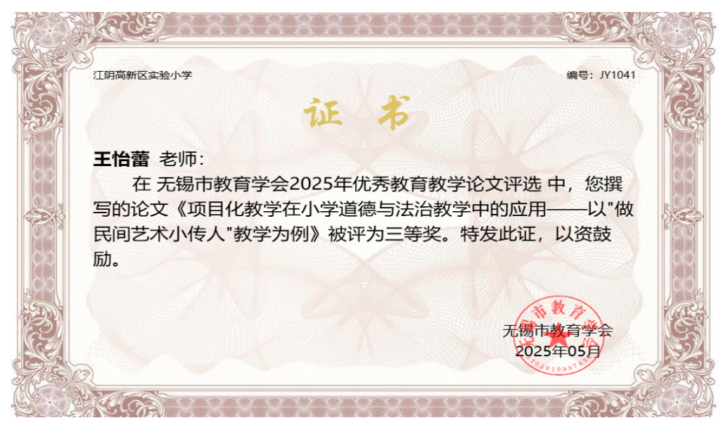 江阴市顾海英德育名师工作室——成员王怡蕾获2025年无锡市优秀论文三等奖