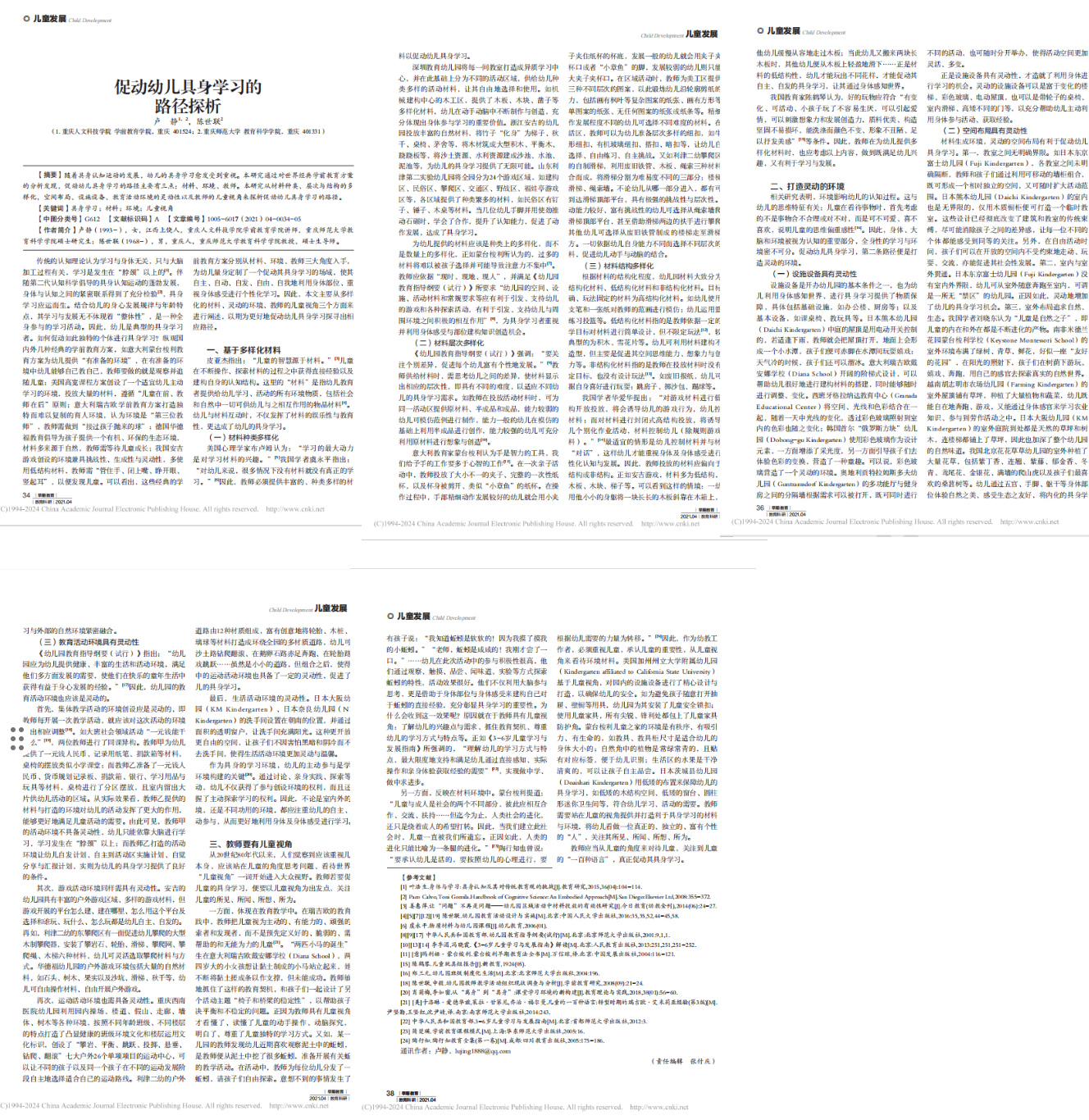 接下来作者从多样化的材料、灵动的环境、教师的儿童视角这三个方面进行阐述:第一是基于多样化材料,材料种类的多样化可以让幼儿自由地选择和使用,为具身学习者重视并利用身体感受与部位建构知识创造机会;材料层次多样化可以适应不同幼儿具身学习需求,这样要求教师在提供材料时需思考幼儿之间的差异,使得材料显示出相应的层次性和难度性,促进幼儿动手与动脑的结合;材料结构多样化多指高结构化材料、低结构材料和非结构化材料,其中最适宜的情形是幼儿控制材料并与材料‘对话’,这样幼儿才能重视身体及身体感受进行个性化认知与发展,这样要求教师投放的材料应偏向于低结构或非结构,使幼儿玩出不同花样。第二就是打造灵动的环,境,环境影响幼儿的认知过程,有助于幼儿全身性的学习,从设施设备具有灵动性,到空间布局的灵动性,再到教育活动环境具有灵动性,激发幼儿的主动参与。通过讨论、亲身实践、探索等活动,幼儿不仅获得了参与创设环境的权利,而且还掌握了主动探索学习的权利。最后,教师要以儿童视角出发,关注儿童的所见、所闻、所想、所为,促动儿童的具身学习。