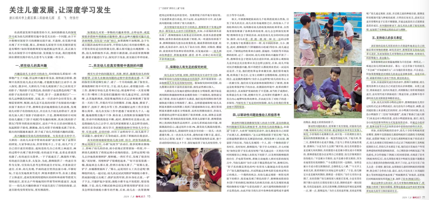 本文聚焦学前教育高质量发展背景下幼儿深度学习的实践路径,系统分析了当前教师在理解深度学习时存在的片面性问题,如过度关注知识传递而忽视过程性探究,并提出核心解决策略,重构认知框架,强调幼儿深度学习需以兴趣为起点,通过情境化活动,如建构游戏、项目探究,激发主动参与;关键支持策略:提出教师应创设开放性问题情境,如“为小鸟安家”项目,引导幼儿在合作中运用高阶思维解决实际问题,促进经验迁移;环境与资源优化:主张利用低结构材料,如自然物、生活用品,替代封闭式材料包,鼓励幼儿自主设计实验方案,培养批判性思维;文中结合绍兴市上虞区幼儿园的实践案例,阐释了深度学习对幼儿认知整合、社会性发展的双向赋能价值,为课程设计提供可操作范式。