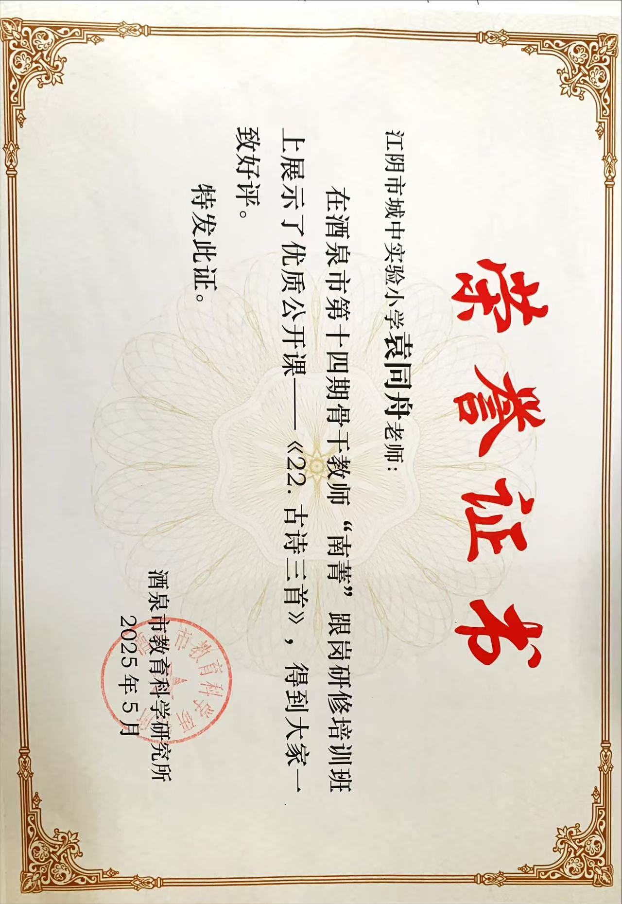网站类目:学科比赛情况 姓名:袁同舟 所在单位:江阴市教育局 获奖类别:酒泉跟岗研训展示课 获奖级别:市级 获奖等级: 获奖时间:2025-09-22 评比部门:酒泉市教育科学研究所 发表刊物: 刊物级别:市级 发表时间:2025-09-22