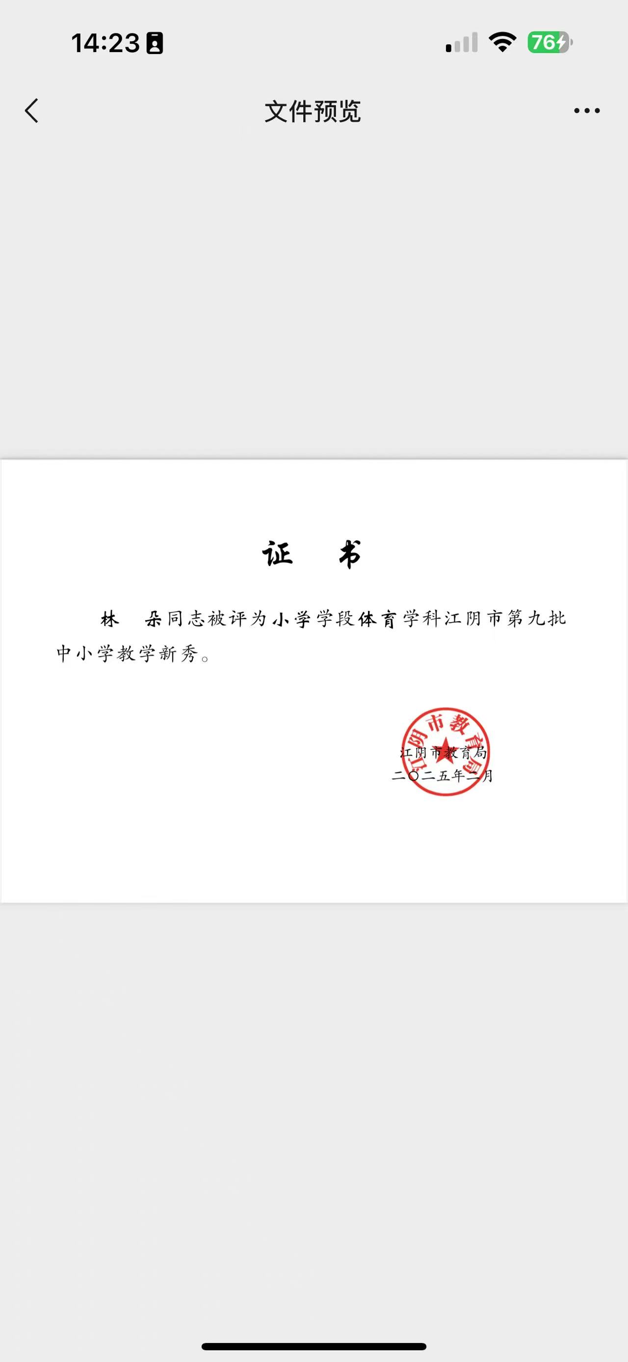 林朵被评为小学体育学科江阴市第九批教学新秀 2025-09-22