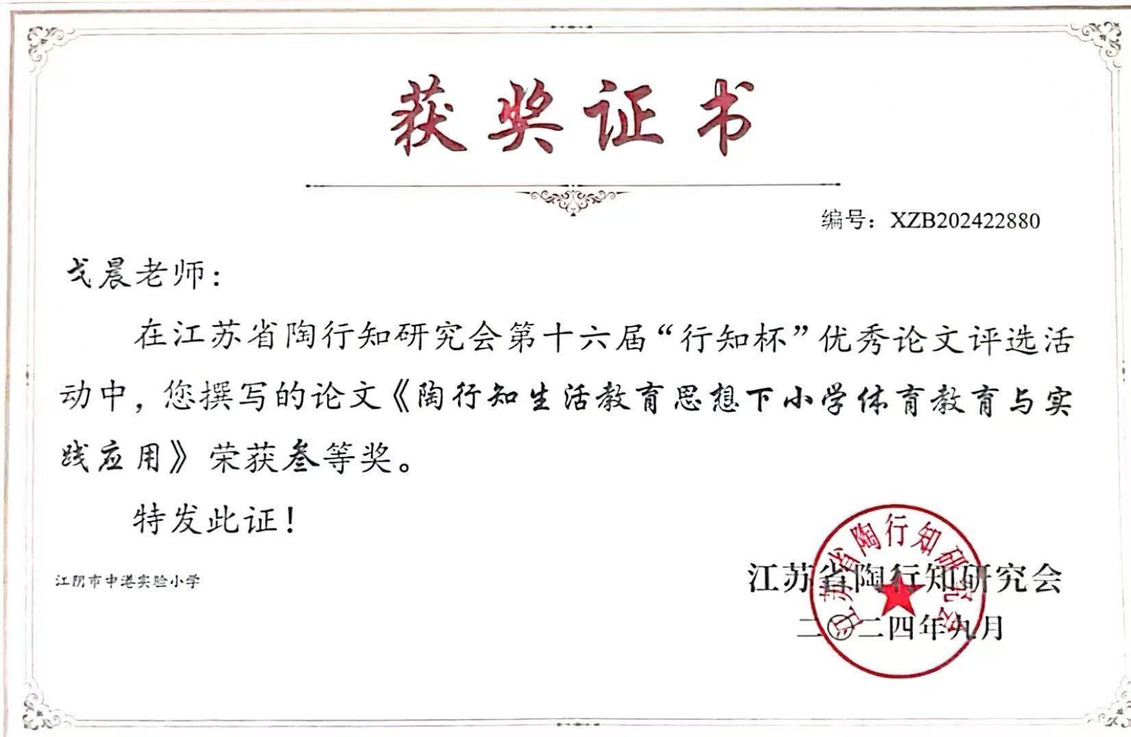 网站类目:研究成果获奖 姓名:戈晨 所在单位:江阴市申港实验小学 获奖类别:江苏省陶行知研究会 获奖级别:省级 获奖等级: 获奖时间:2024-09-01 评比部门:江阴市教师发展中心 发表刊物: 刊物级别:国家级 发表时间:2025-09-22
