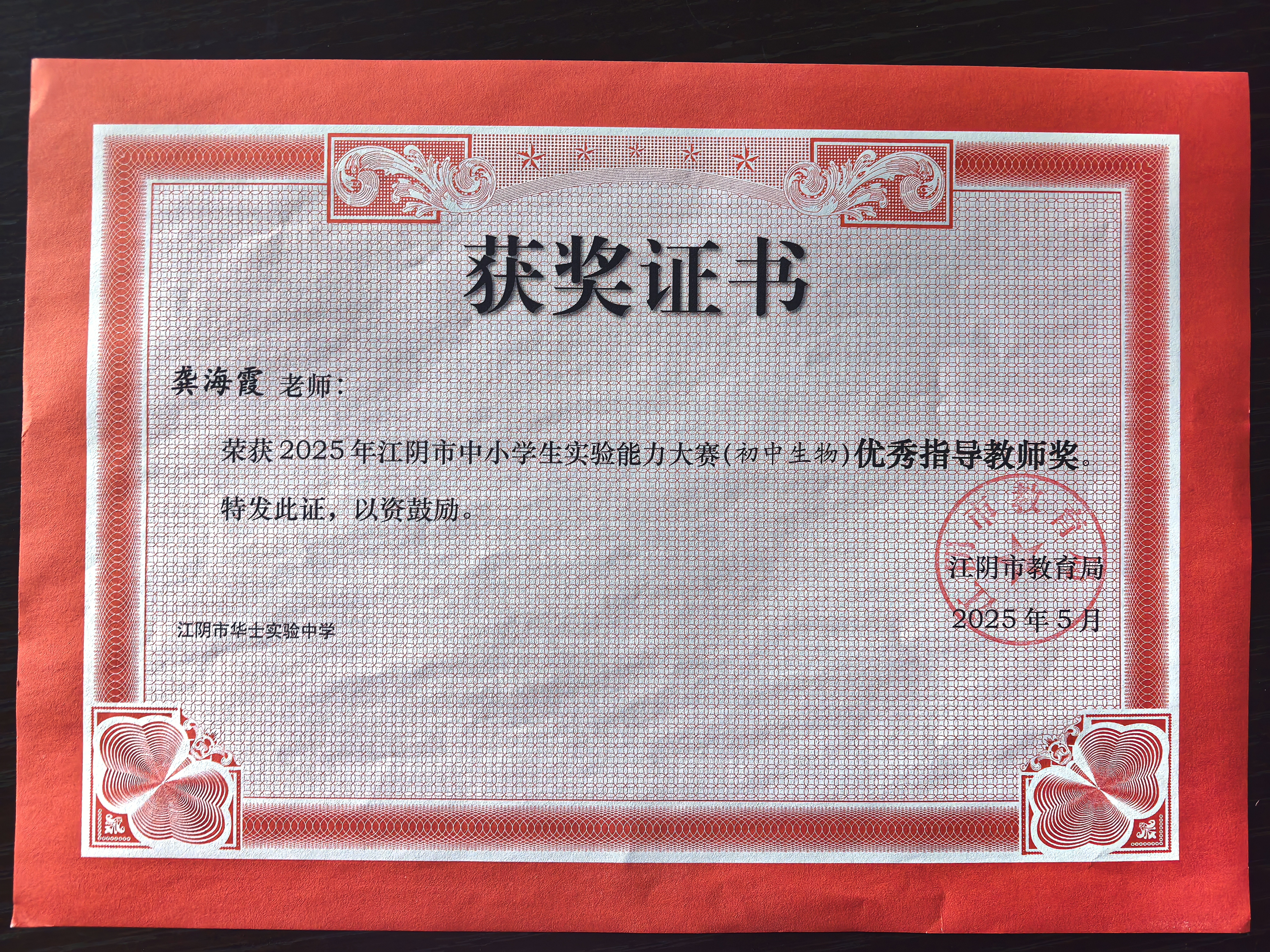 2025年江阴市中小学生实验能力大赛优秀指导教师奖