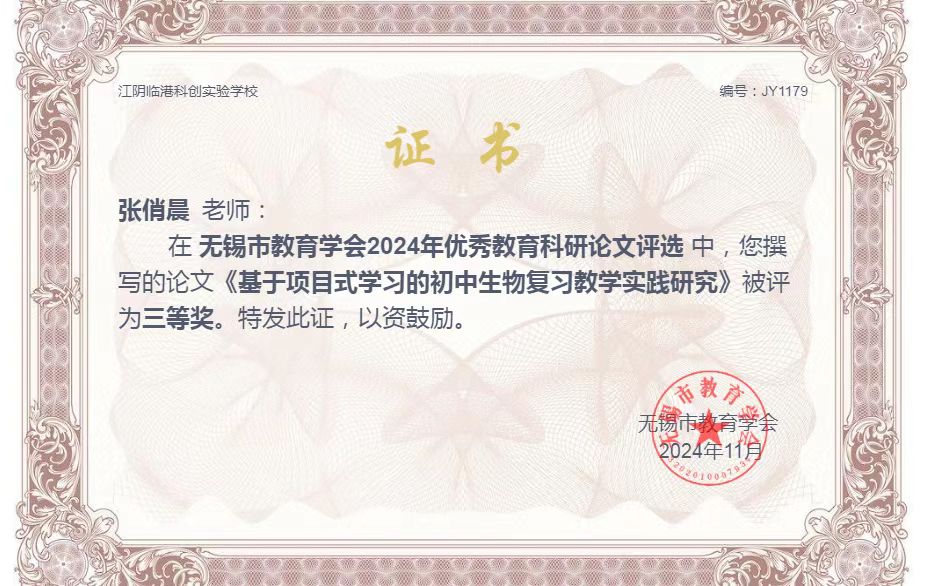 无锡市教育学会2024年优秀教育科研论文评选三等奖 2025-09-23