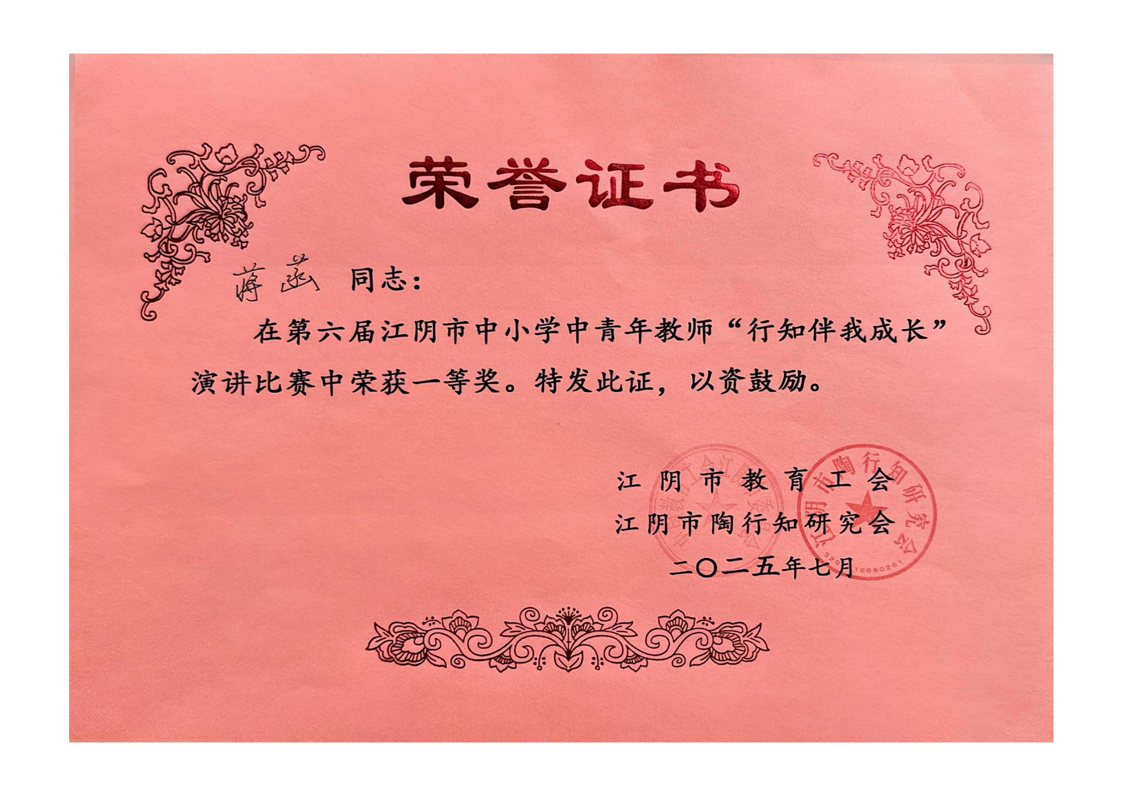 蒋菡老师在江阴市青年教师“行知伴我成长”演讲比赛中获一等奖