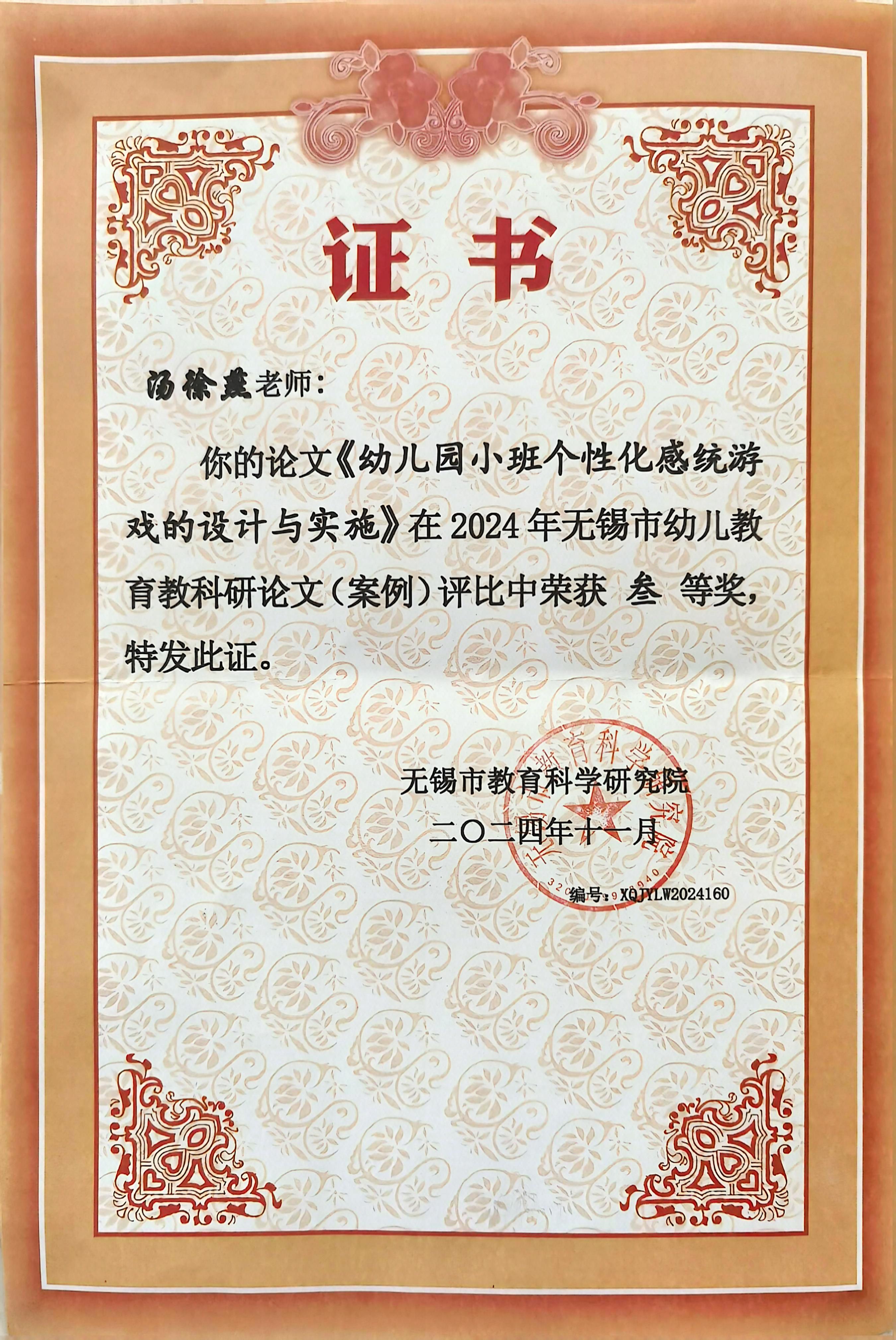 汤徐燕老师撰写的论文在无锡市幼儿教育教科研论文评比中获三等奖 2025-09-23