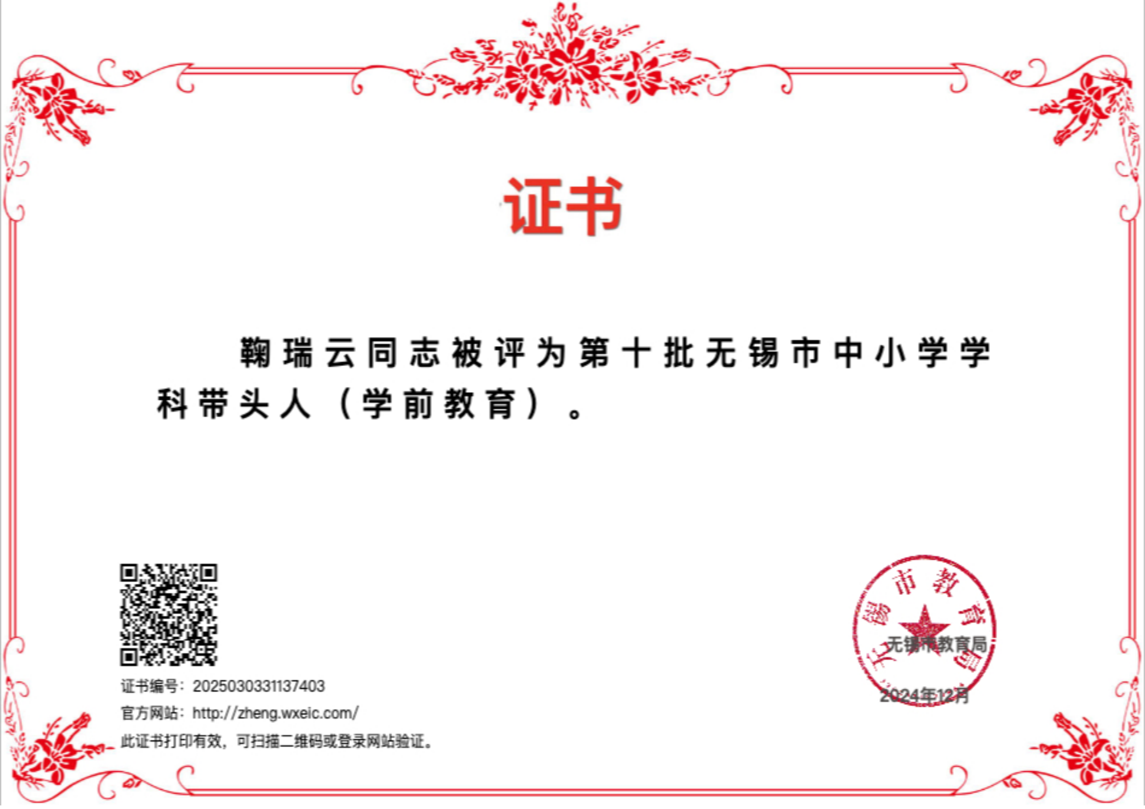 鞠瑞云老师被评为第十批无锡市中小学学科带头人 2025-09-23