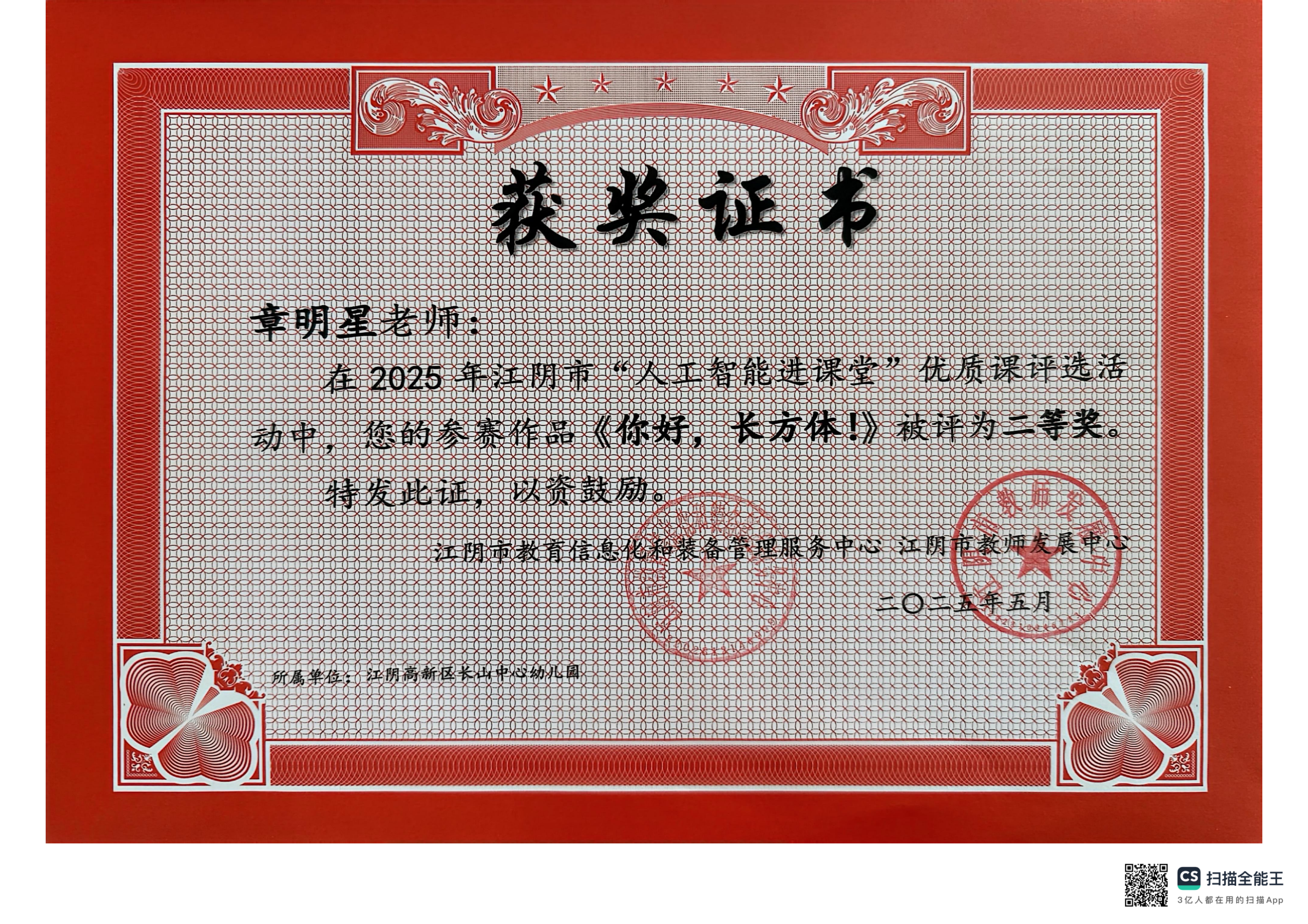 章明星在江阴市人工智能进课堂优质课评选活动《你好,长方体》获二等奖
