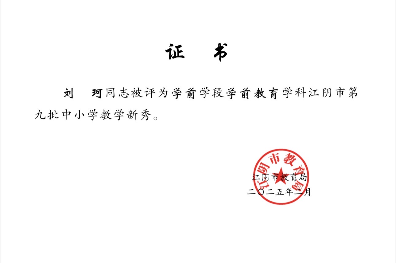 刘珂被评为江阴市第九批中小学教学新秀 2025-09-23