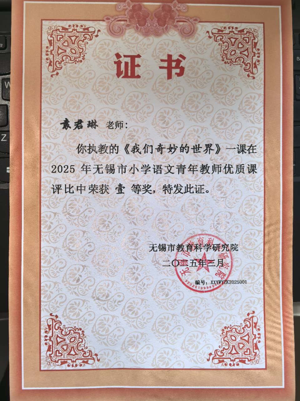 袁君琳获评无锡市优质课展评活动一等奖