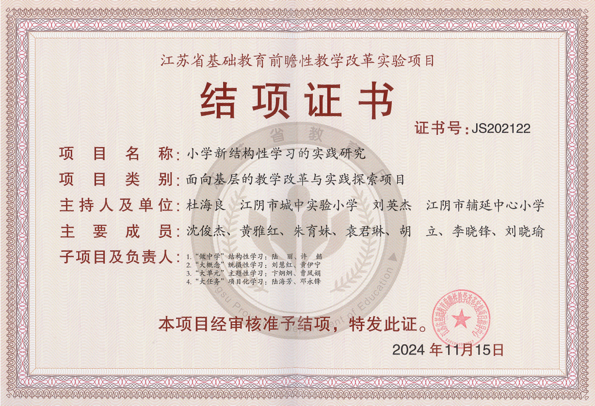 “小学新结构性学习的实践研究”获江苏省基础教育前瞻性教学改革实验项目结题