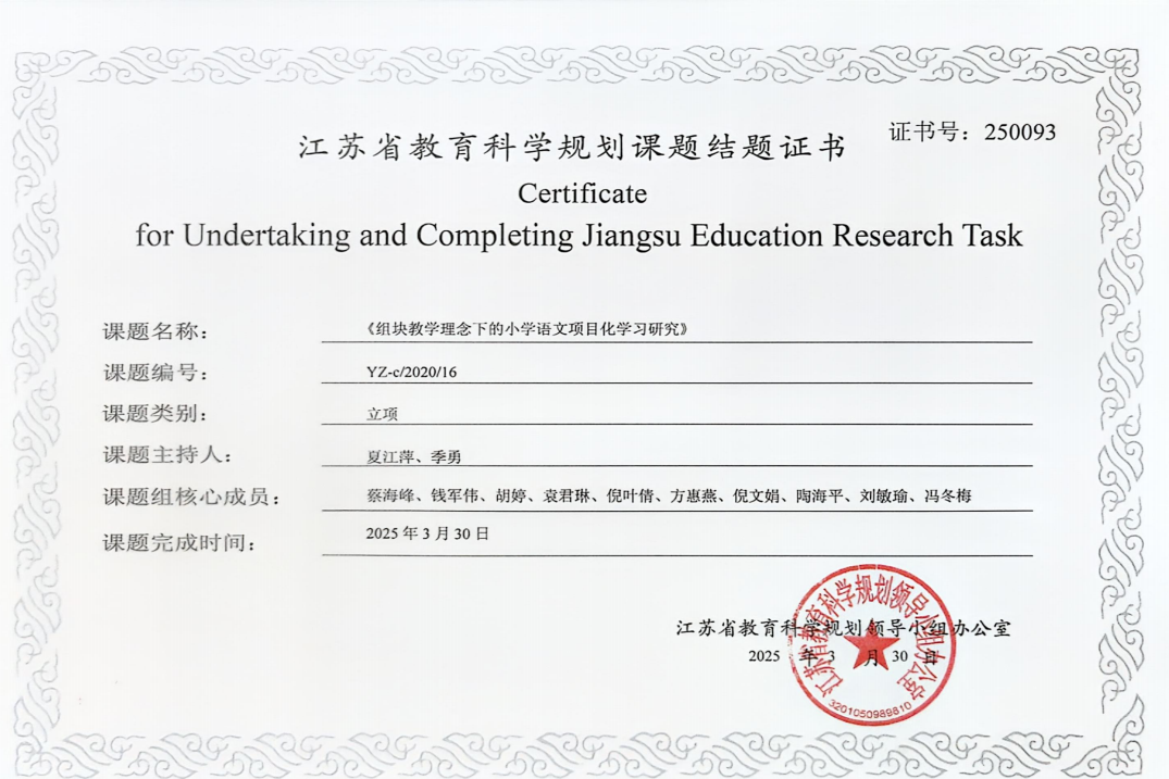 “组块教学理念下的小学语文项目化学习研究”获江苏省教育科学规划课题结题 2025-09-23