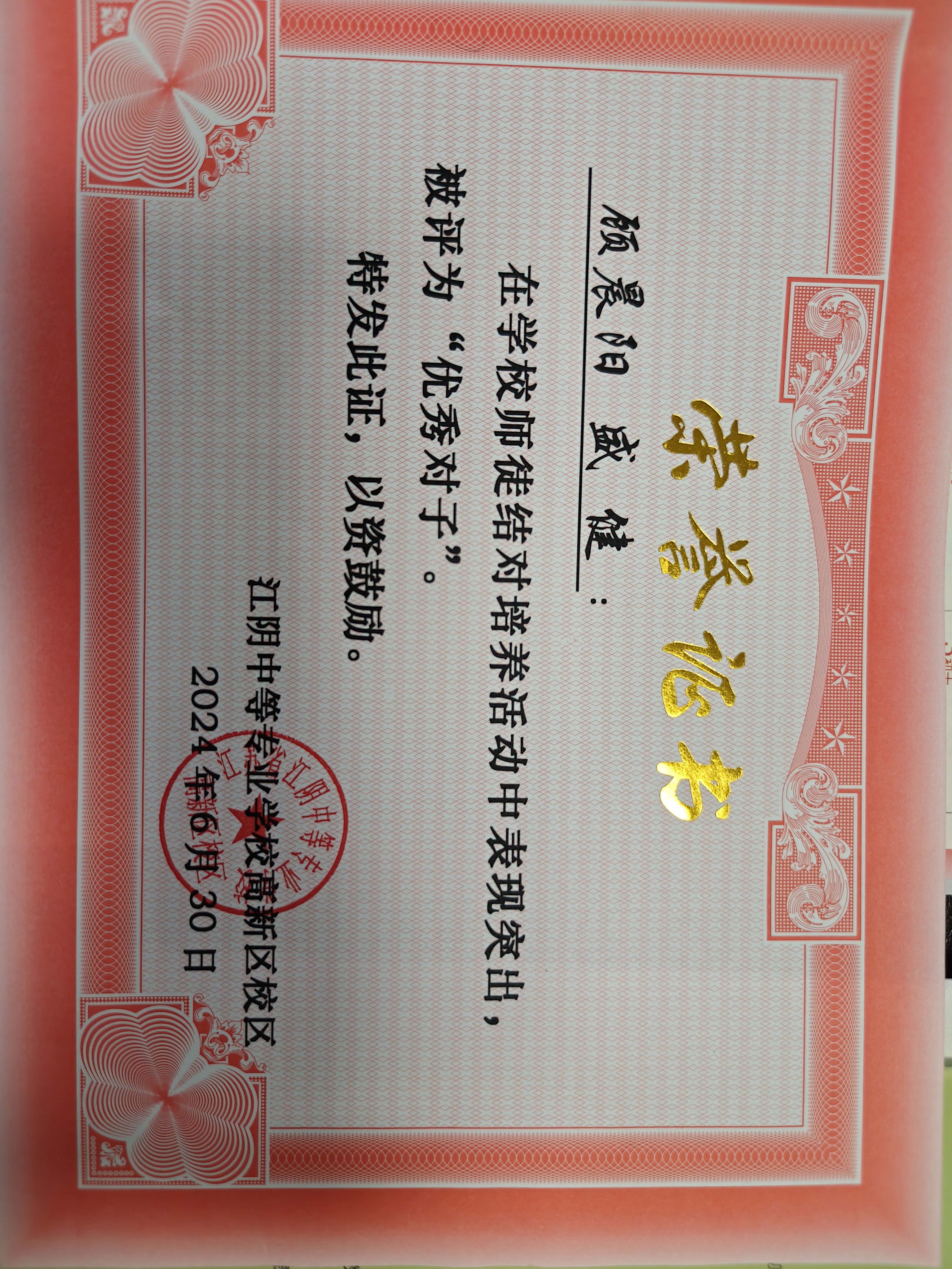 顾晨阳、盛健2024.6获师徒结对“优秀对子”