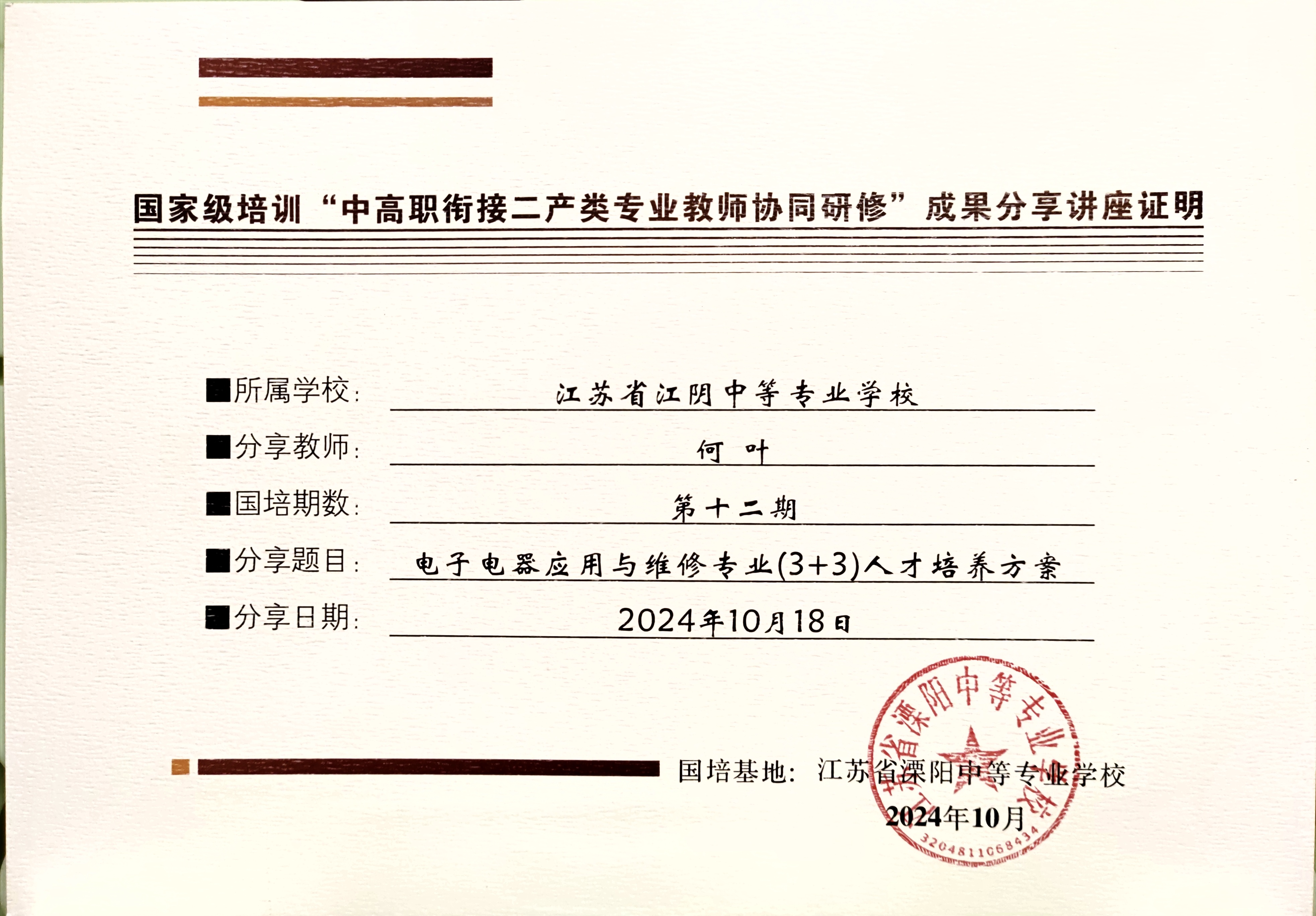 何叶老师在国家级培训“中高职衔接二产类专业教师协同研修”成果分享讲座《电子电器应用与维修专业(3+3)人才培养方案》