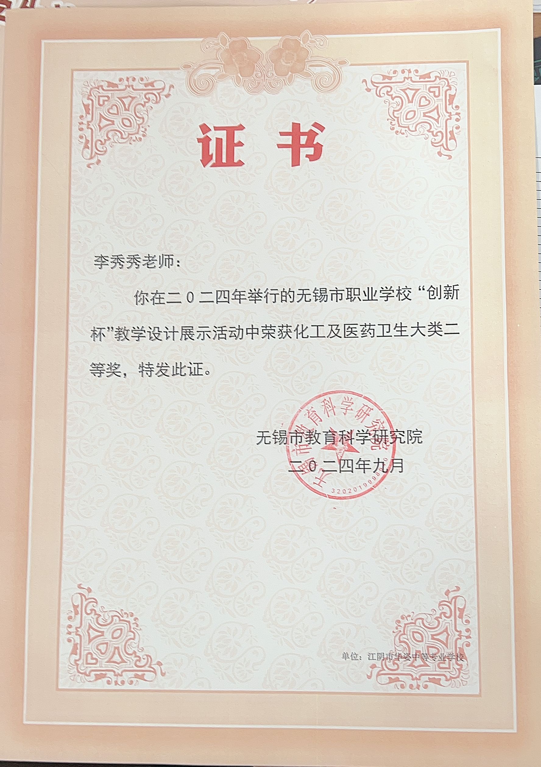 李秀秀老师在2024年举行的无锡市职业学校“创新杯”教学设计展示活动中荣获化工及医药卫生大类二等奖