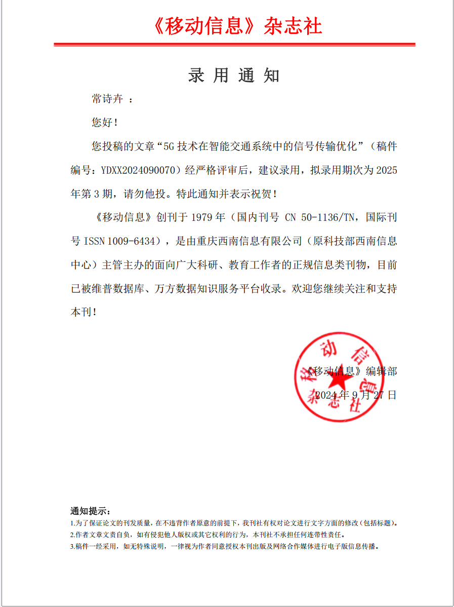 常诗卉老师的论文《5G技术在智能交通系统中的信号传输优化》被《移动信息》杂志录用 2025-09-24