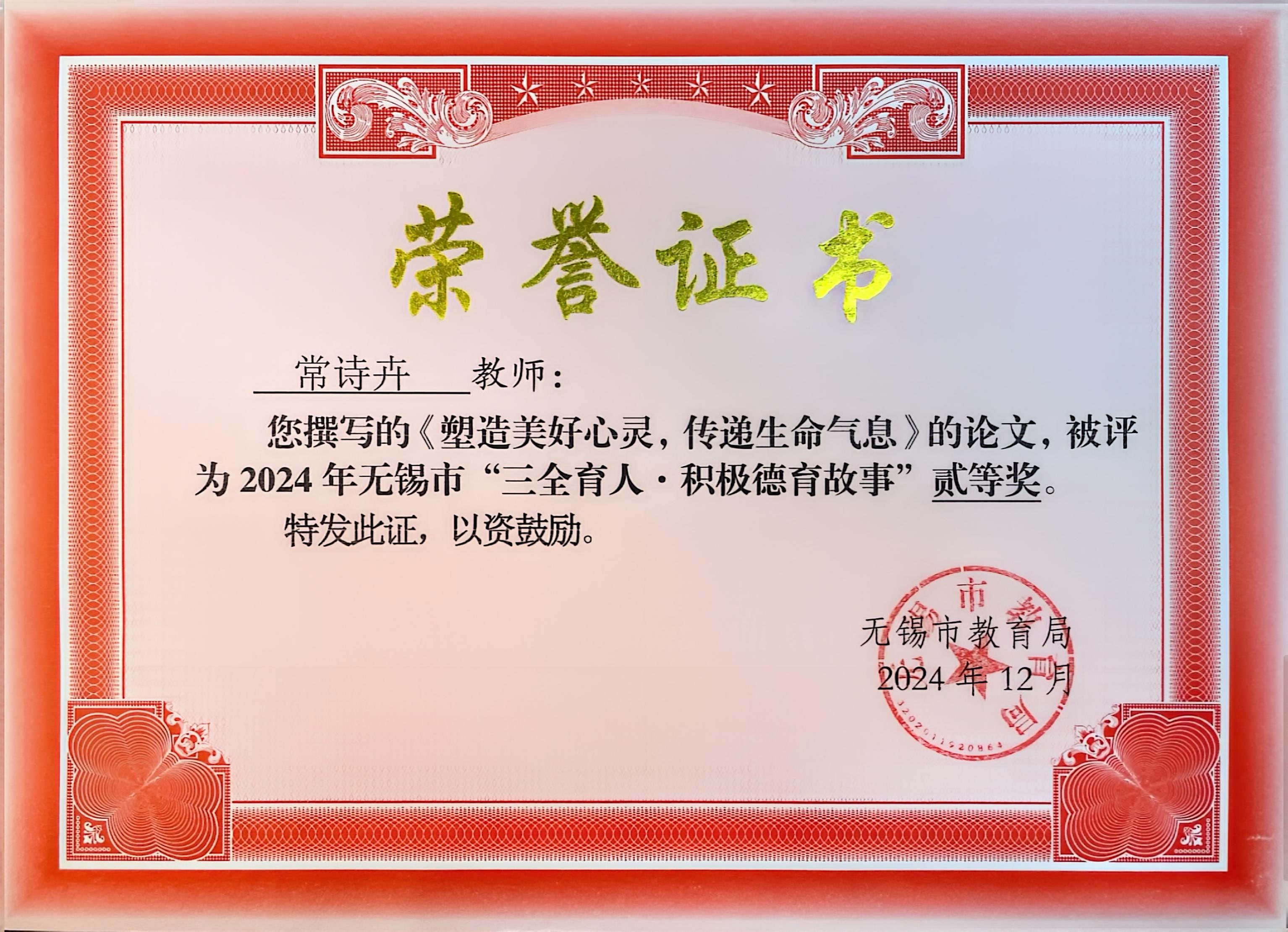 常诗卉老师的论文《塑造美好心灵,传递生命气息》被评为无锡市“三全育人 积极德育故事”二等奖