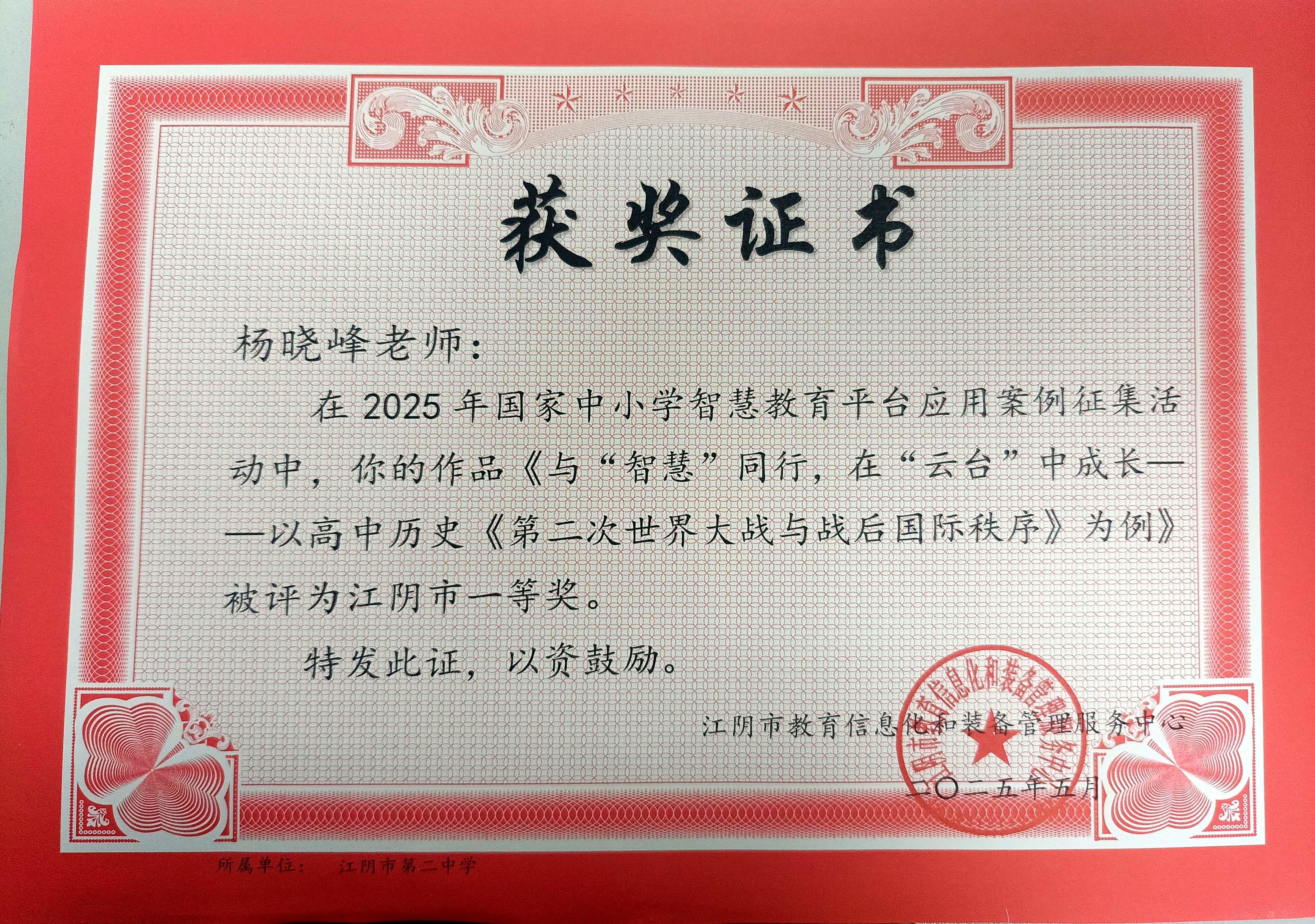 杨晓峰老师获2025年国家中小学智慧教育平台应用案例征集活动获江阴市一等奖 2025-09-24