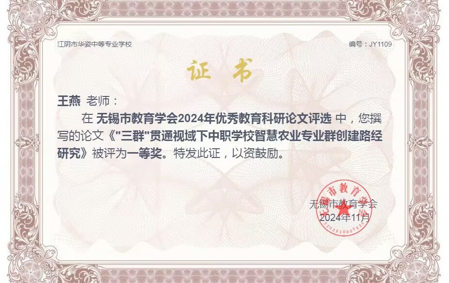 王燕老师的论文《三群贯通视域下中职学校智慧农业专业群创建路径研究》在无锡市教育学会论文评选中获一等奖